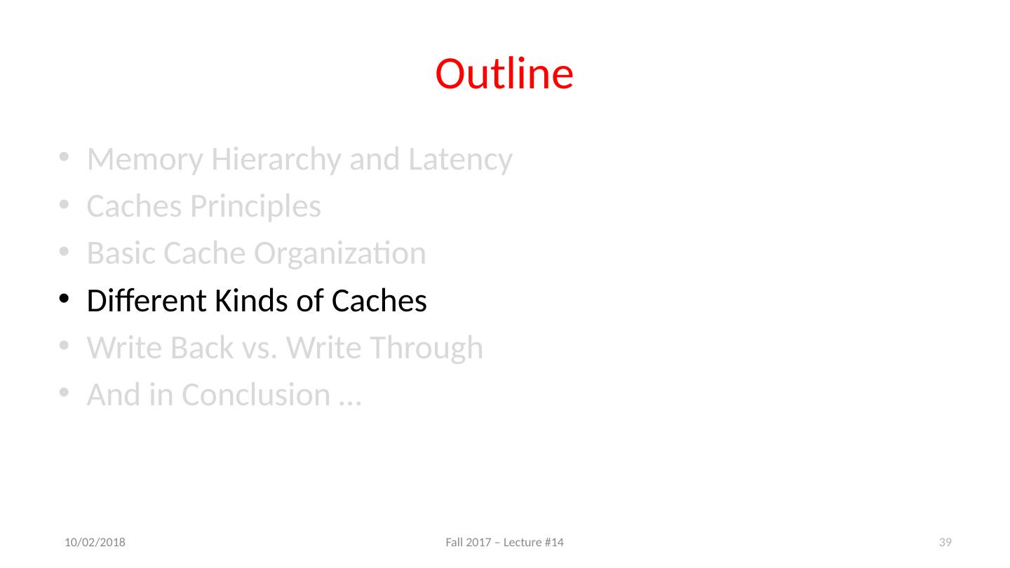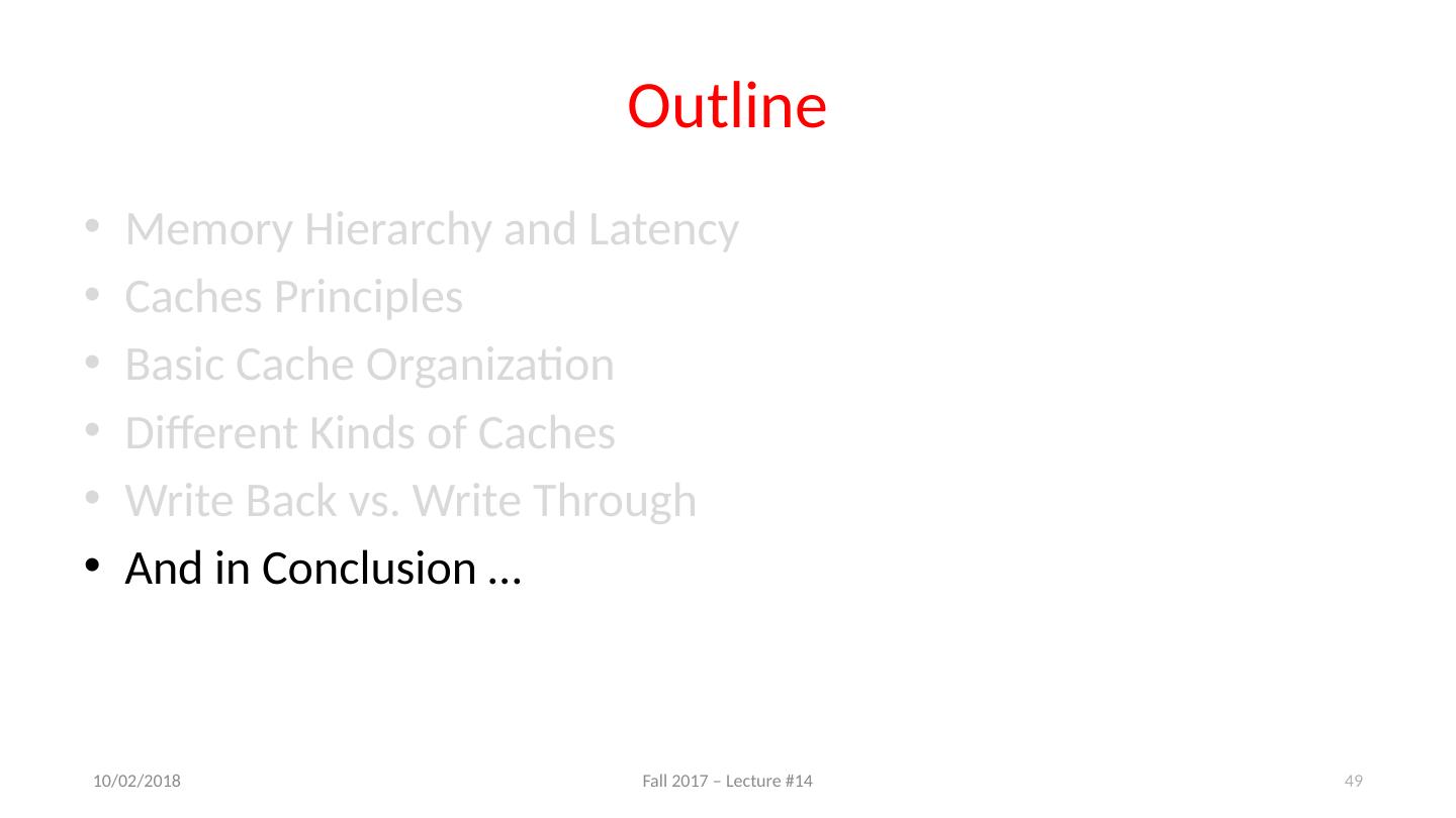 12 .Outline Memory Hierarchy and Latency Caches Principles Basic Cache Organization Different Kinds of Caches Write Back vs. Write Through And in Conclusion … 10/11/17 Fall 2017 – Lecture #14 12