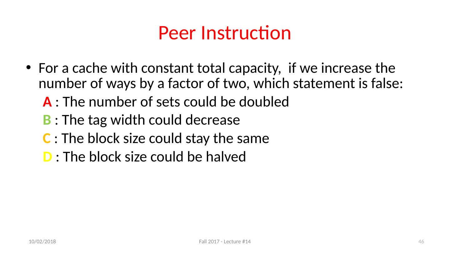 29 .Tag Data 252 12 1022 99 511 11 2041 20 Cache Replacement Suppose processor now requests location 511, which contains 11? Doesn’t match any cache block, so must “evict” a resident block to make room Which block to evict? Replace “victim” with new memory block at address 511 10/11/17 Fall 2017 - Lecture #14 29