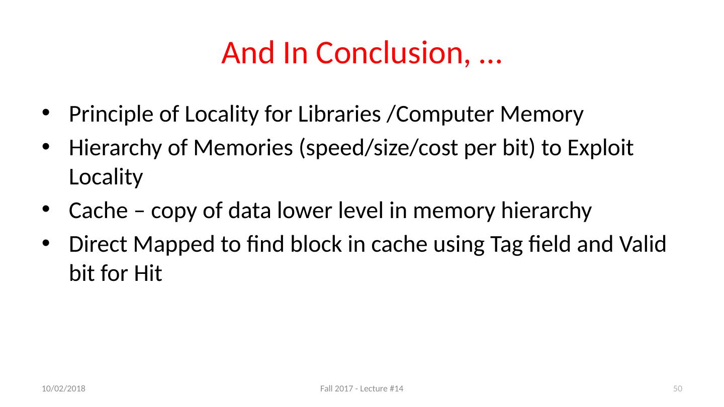 23 .Memory Access with Cache Load word instruction: lw t0,0(t1) t1 contains 1022 ten, Memory[1022] = 99 With cache: Processor issues address 1022 ten to Cache Cache checks to see if has copy of data at address 1022 ten 2a. If finds a match ( Hit ): cache reads 99, sends to processor 2b. No match ( Miss ): cache sends address 1022 to Memory Memory reads 99 at address 1022 ten Memory sends 99 to Cache Cache replaces word with new 99 Cache sends 99 to processor Processor loads 99 into register t0 10/11/17 Fall 2017 - Lecture #14 23