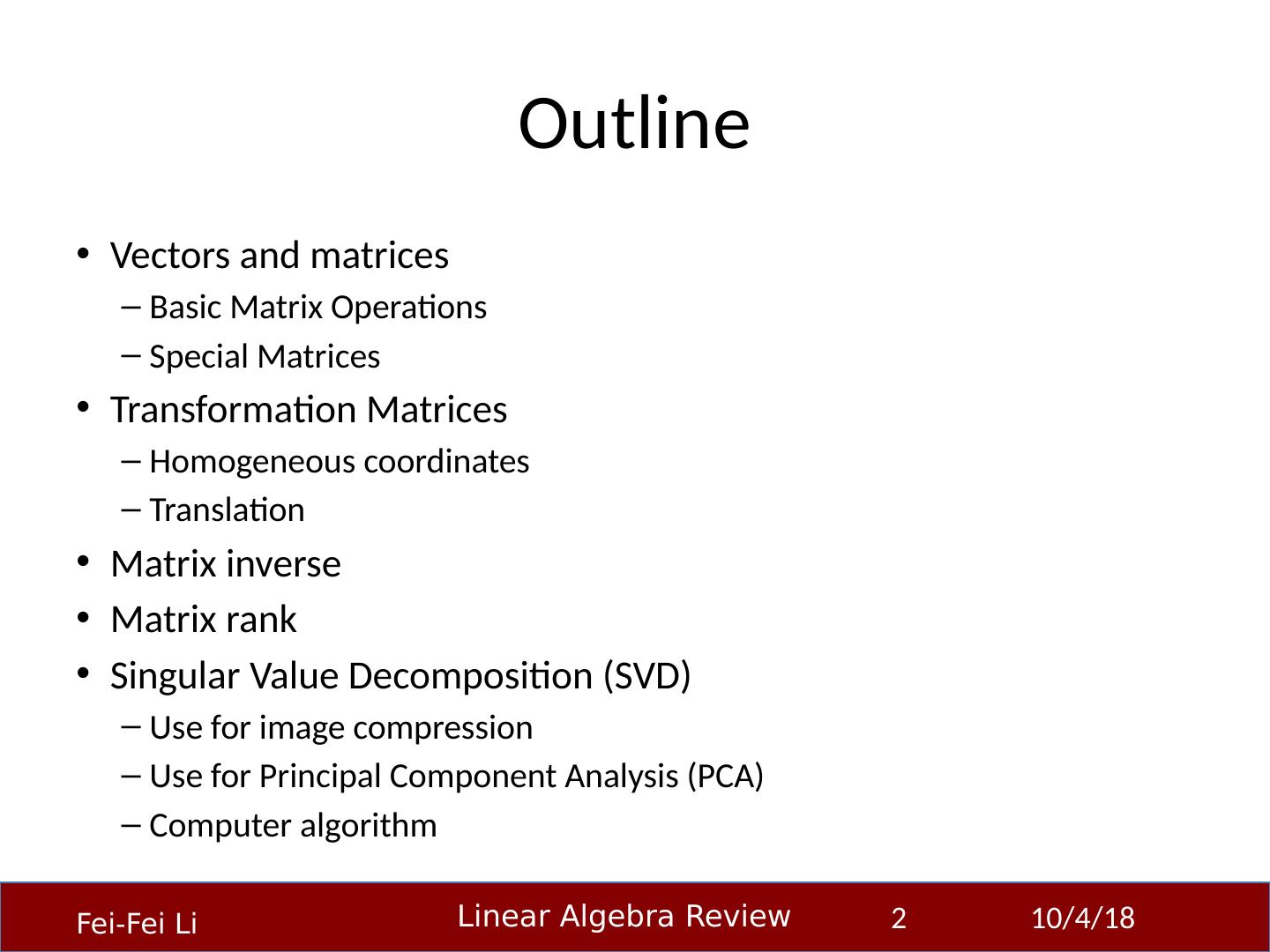 2 .Outline Vectors and matrices Basic Matrix Operations Special Matrices Transformation Matrices Homogeneous coordinates Translation Matrix inverse Matrix rank Singular Value Decomposition (SVD) Use for image compression Use for Principal Component Analysis (PCA) Computer algorithm 23-Sep-14 2