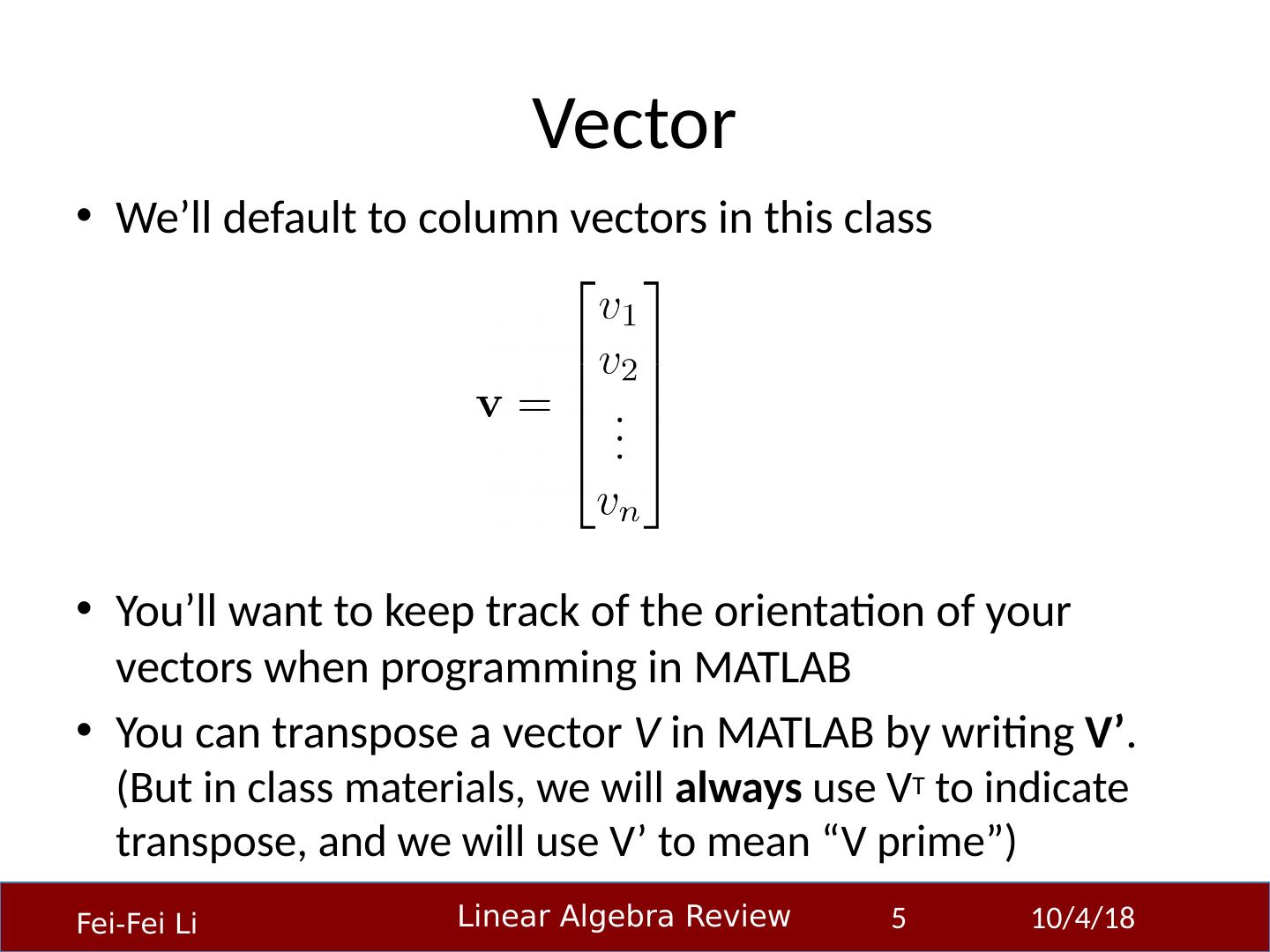 5 .Vector We’ll default to column vectors in this class You’ll want to keep track of the orientation of your vectors when programming in MATLAB You can transpose a vector V in MATLAB by writing V’ . (But in class materials, we will always use V T to indicate transpose, and we will use V’ to mean “V prime”) 23-Sep-14 5