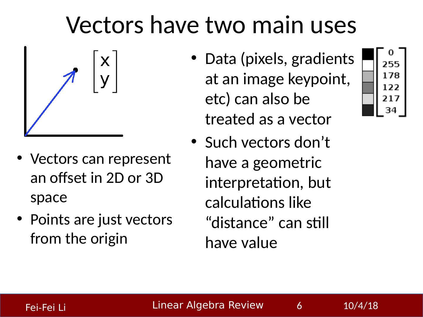 6 .Vectors have two main uses Vectors can represent an offset in 2D or 3D space Points are just vectors from the origin 23-Sep-14 6 Data (pixels, gradients at an image keypoint , etc ) can also be treated as a vector Such vectors don’t have a geometric interpretation, but calculations like “distance” can still have value