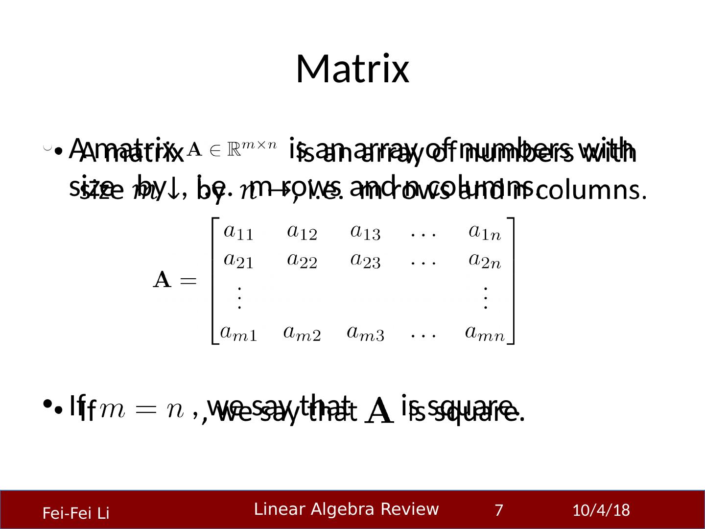 7 .Matrix A matrix is an array of numbers with size by , i.e. m rows and n columns. If , we say that is square. 23-Sep-14 7