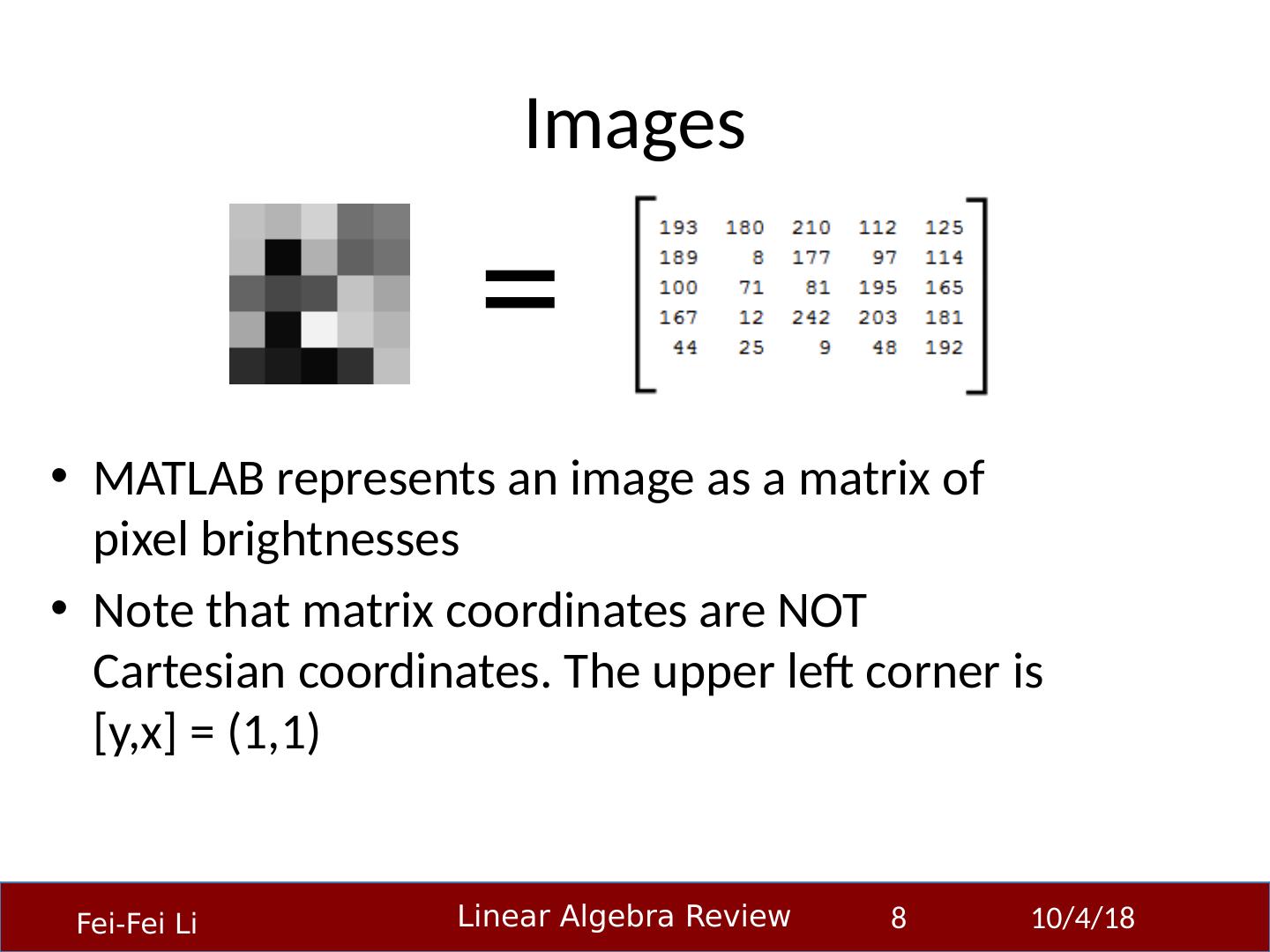 8 .Images 23-Sep-14 8 MATLAB represents an image as a matrix of pixel brightnesses Note that matrix coordinates are NOT Cartesian coordinates. The upper left corner is [ y,x ] = (1,1) =