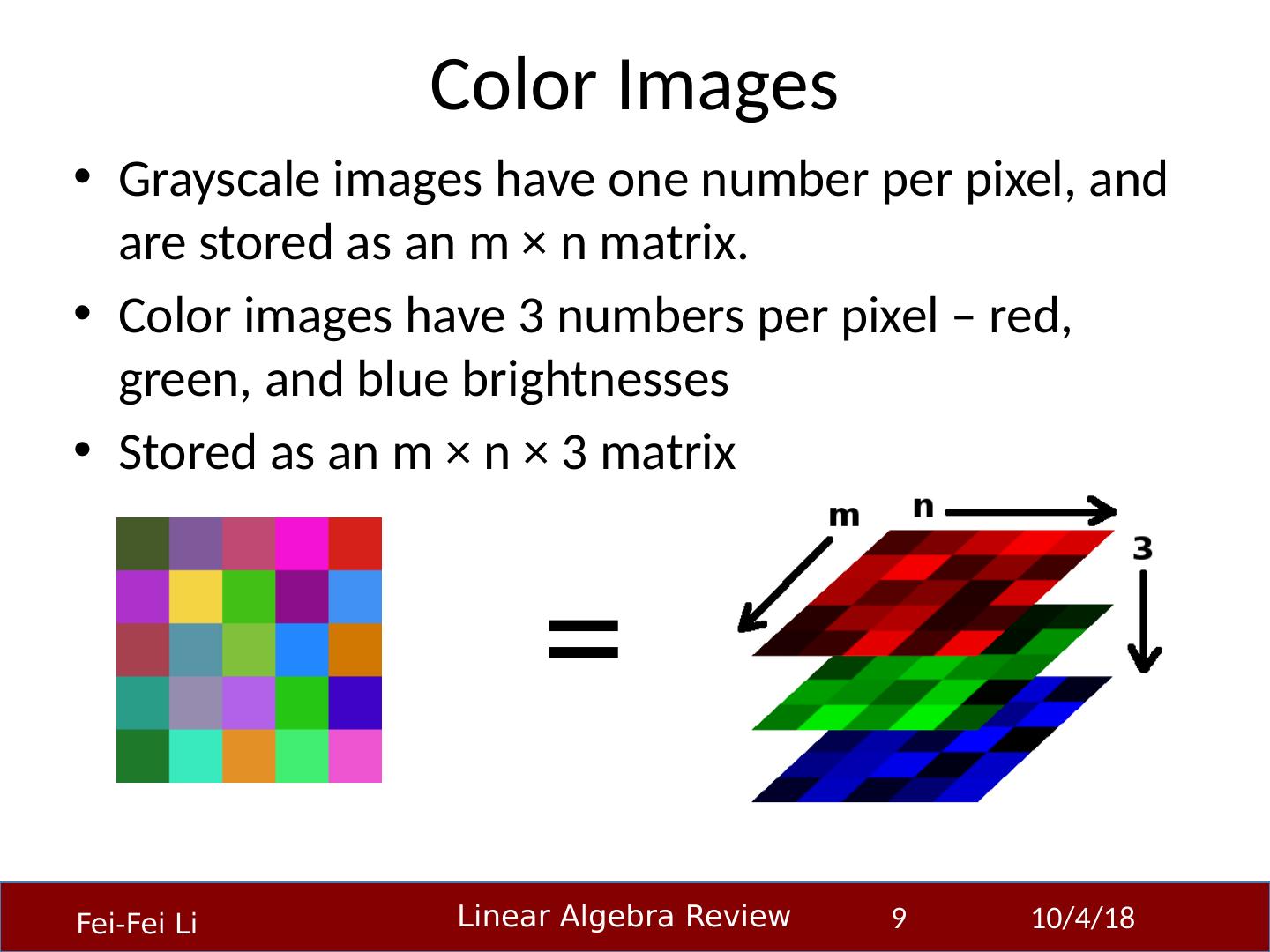 9 .Color Images Grayscale images have one number per pixel, and are stored as an m × n matrix. Color images have 3 numbers per pixel – red, green, and blue brightnesses Stored as an m × n × 3 matrix 23-Sep-14 9 =