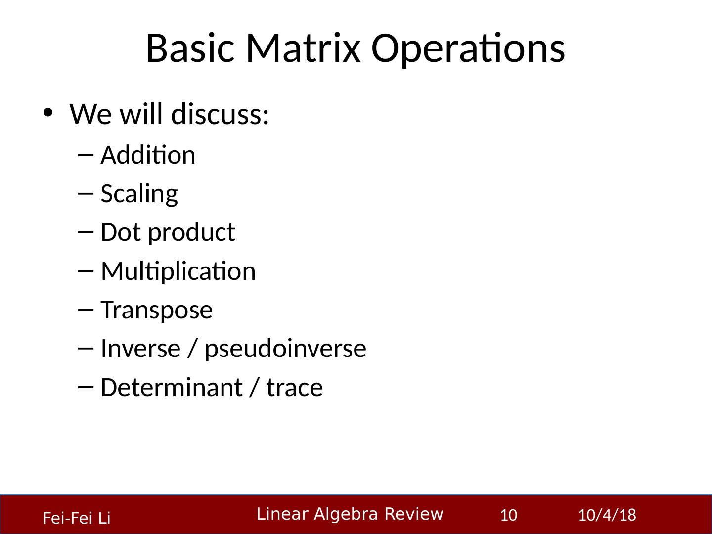 10 .Basic Matrix Operations We will discuss: Addition Scaling Dot product Multiplication Transpose Inverse / pseudoinverse Determinant / trace 23-Sep-14 10