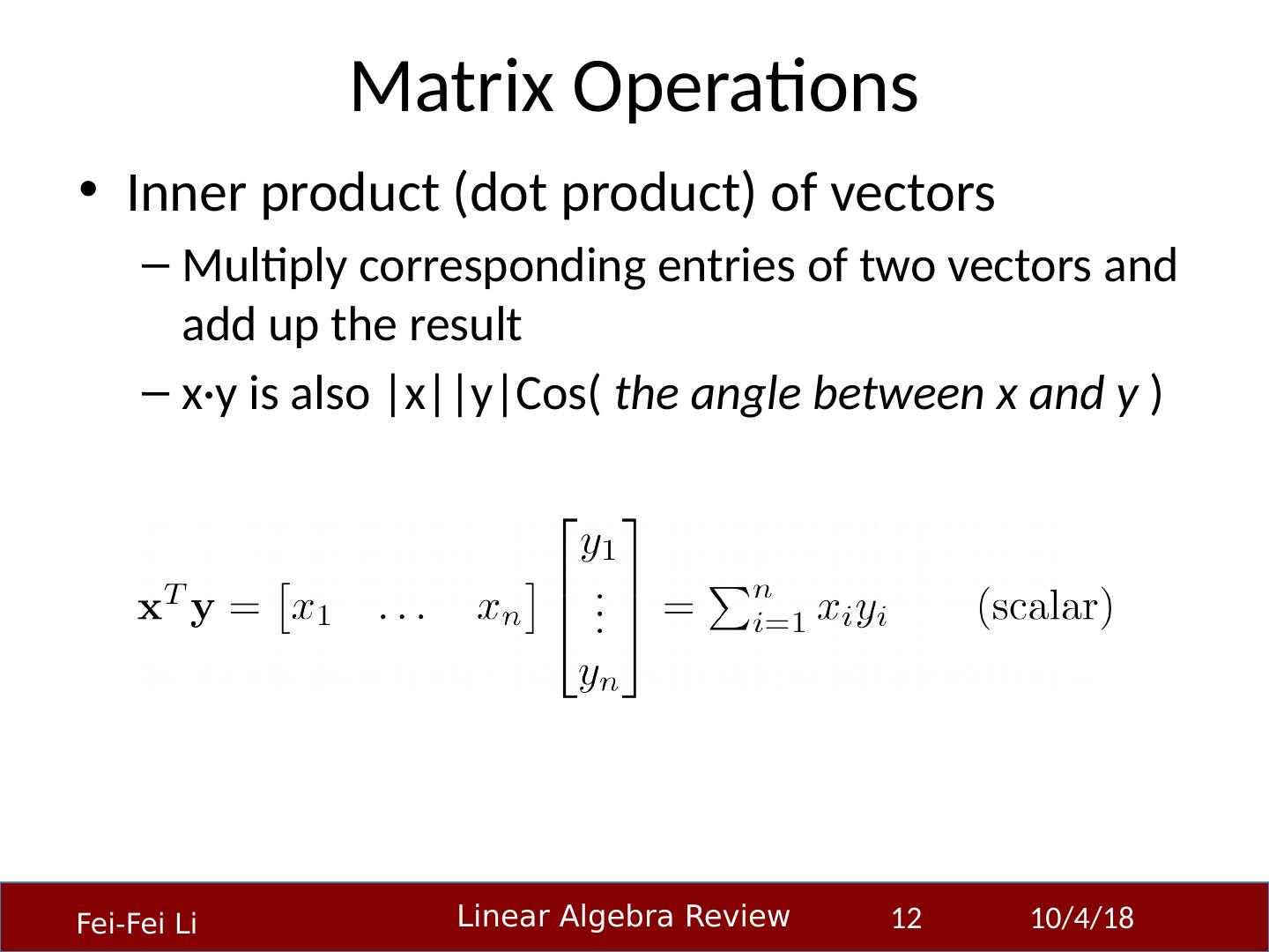 12 .Matrix Operations Inner product (dot product) of vectors Multiply corresponding entries of two vectors and add up the result x·y is also |x|| y|Cos ( the angle between x and y ) 23-Sep-14 12