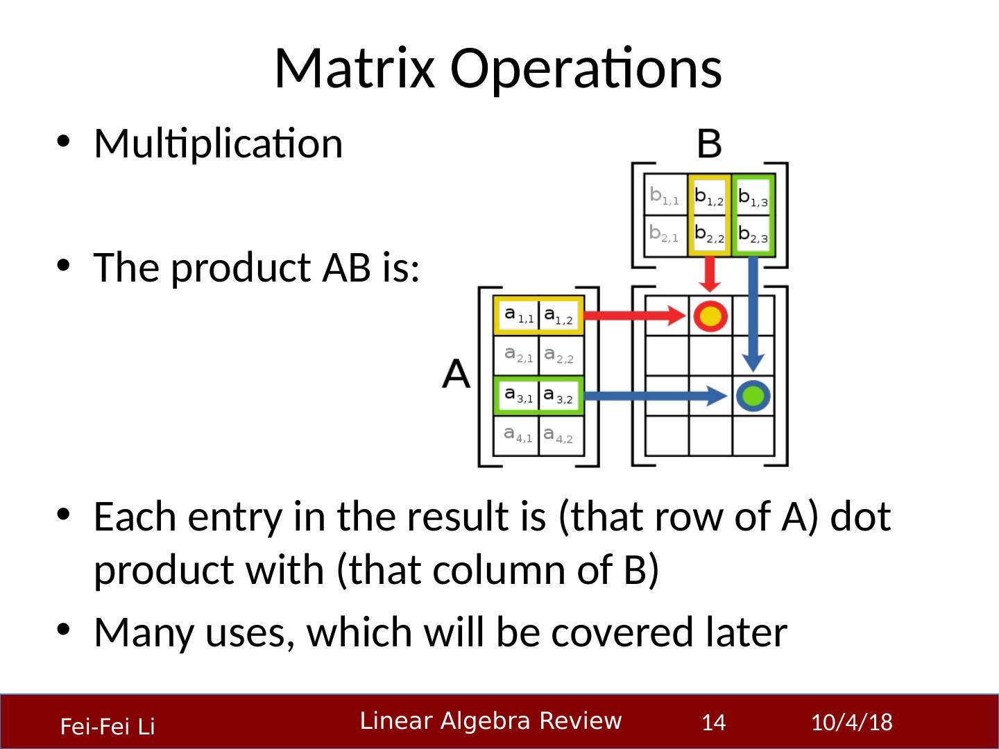 14 .Matrix Operations Multiplication The product AB is: Each entry in the result is (that row of A) dot product with (that column of B) Many uses, which will be covered later 23-Sep-14 14