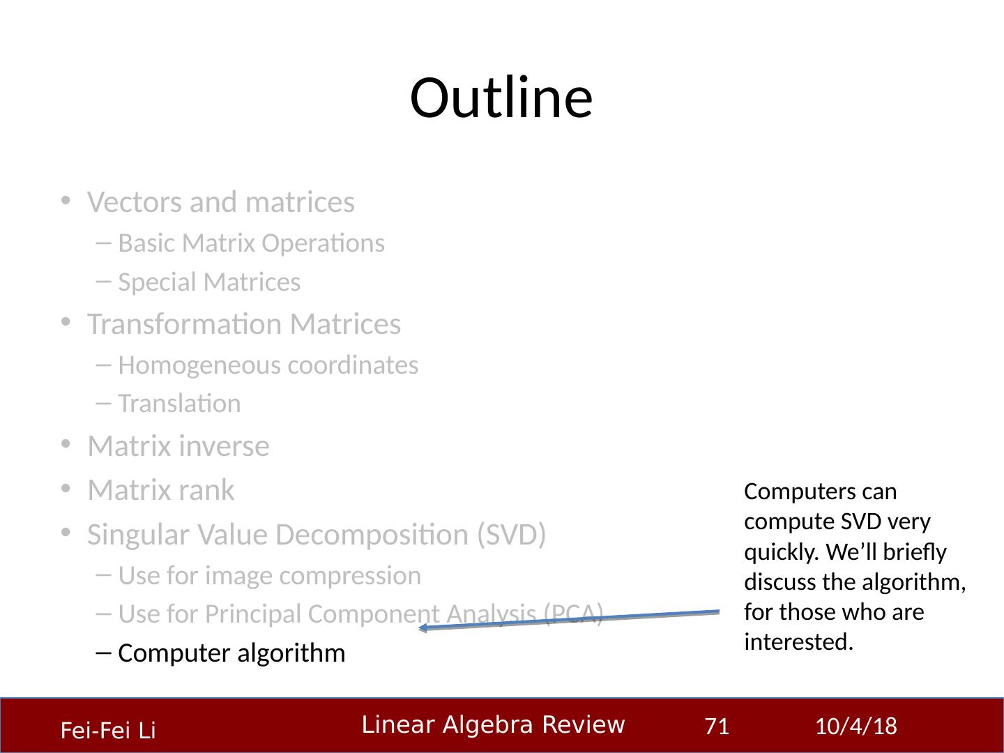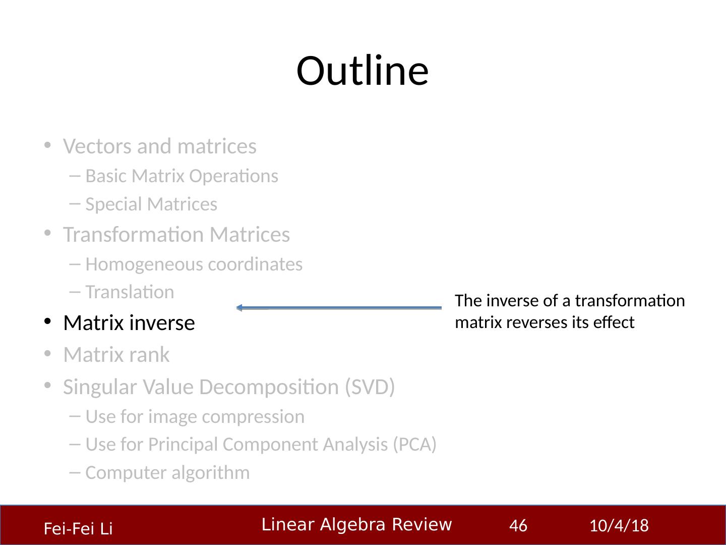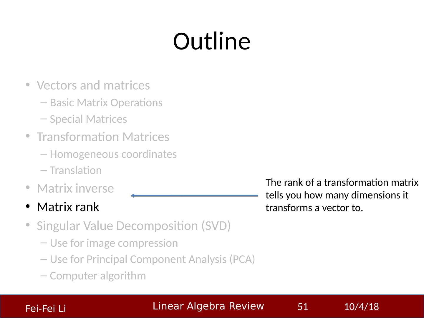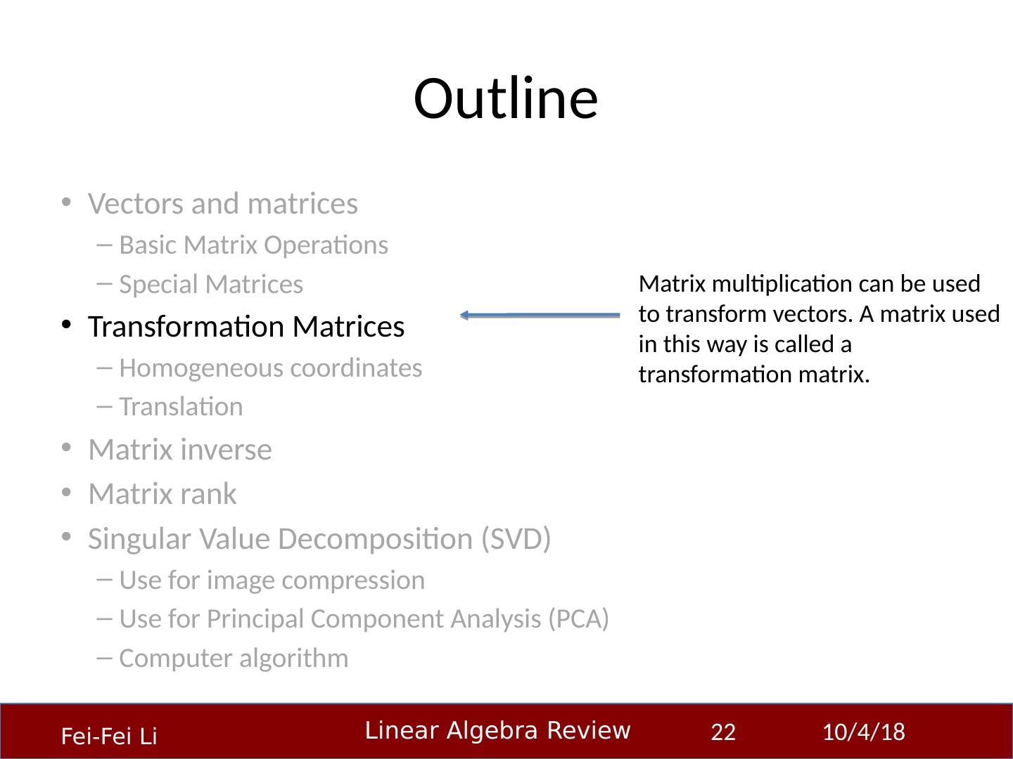 22 .Outline Vectors and matrices Basic Matrix Operations Special Matrices Transformation Matrices Homogeneous coordinates Translation Matrix inverse Matrix rank Singular Value Decomposition (SVD) Use for image compression Use for Principal Component Analysis (PCA) Computer algorithm 23-Sep-14 22 Matrix multiplication can be used to transform vectors. A matrix used in this way is called a transformation matrix.