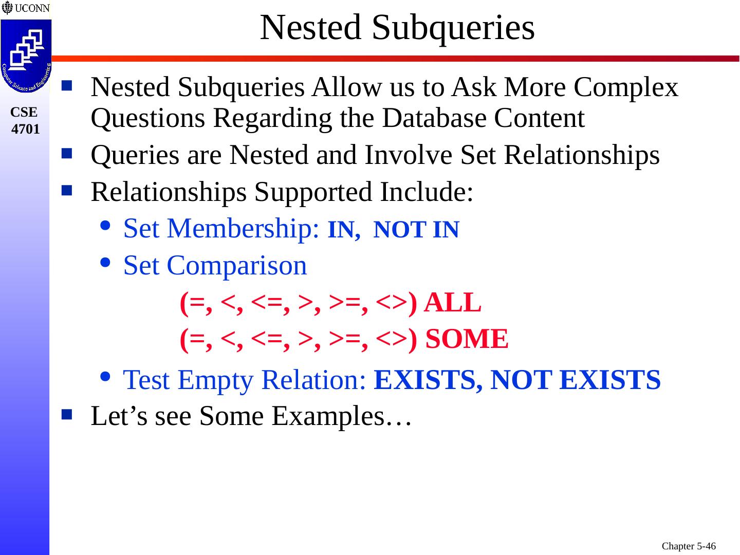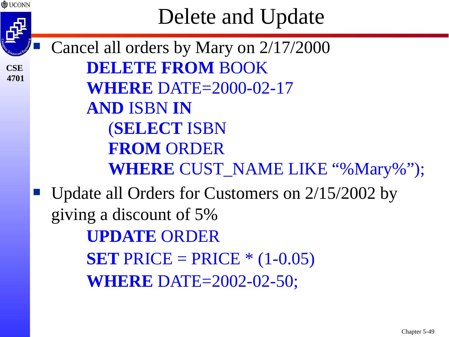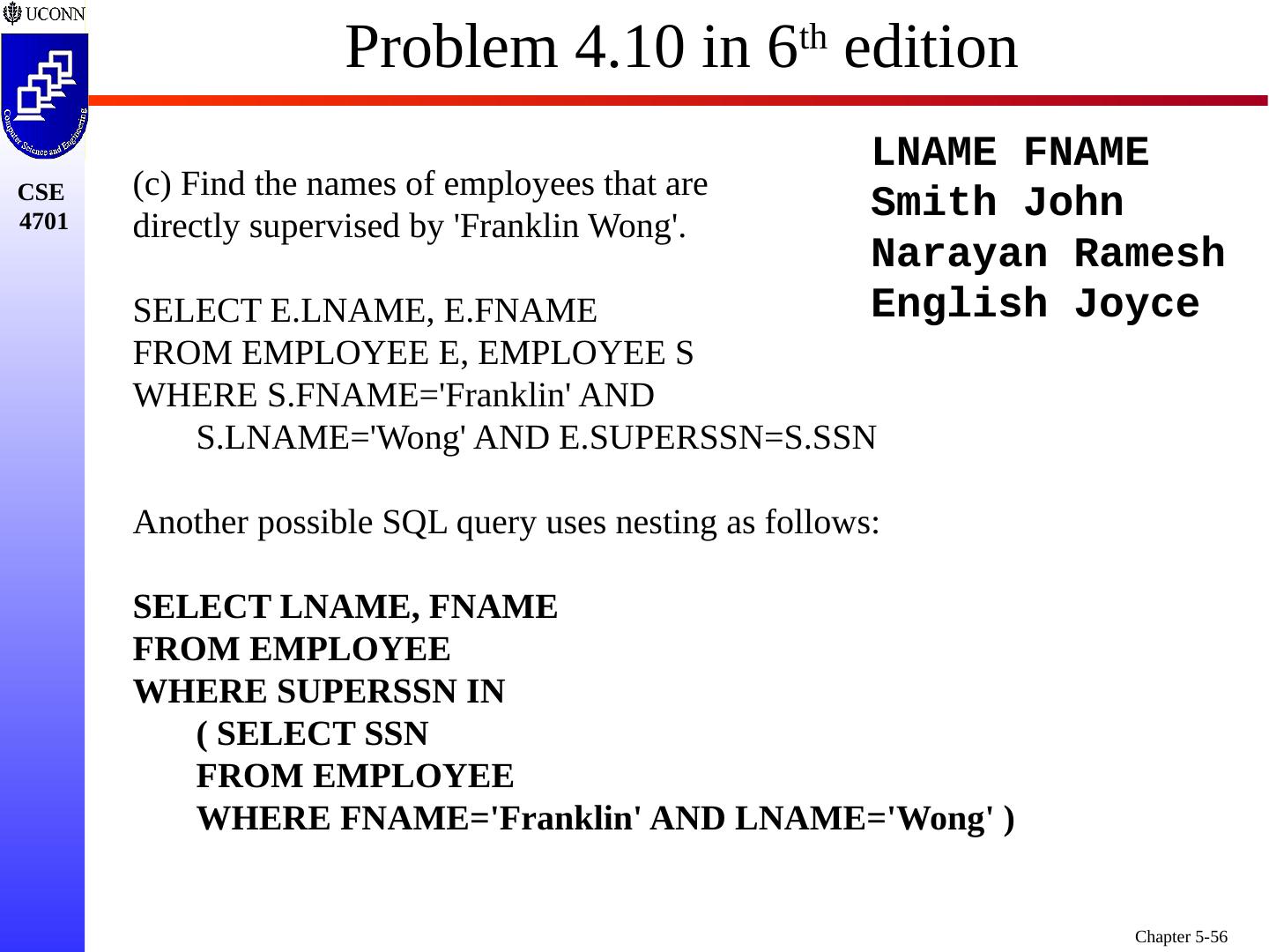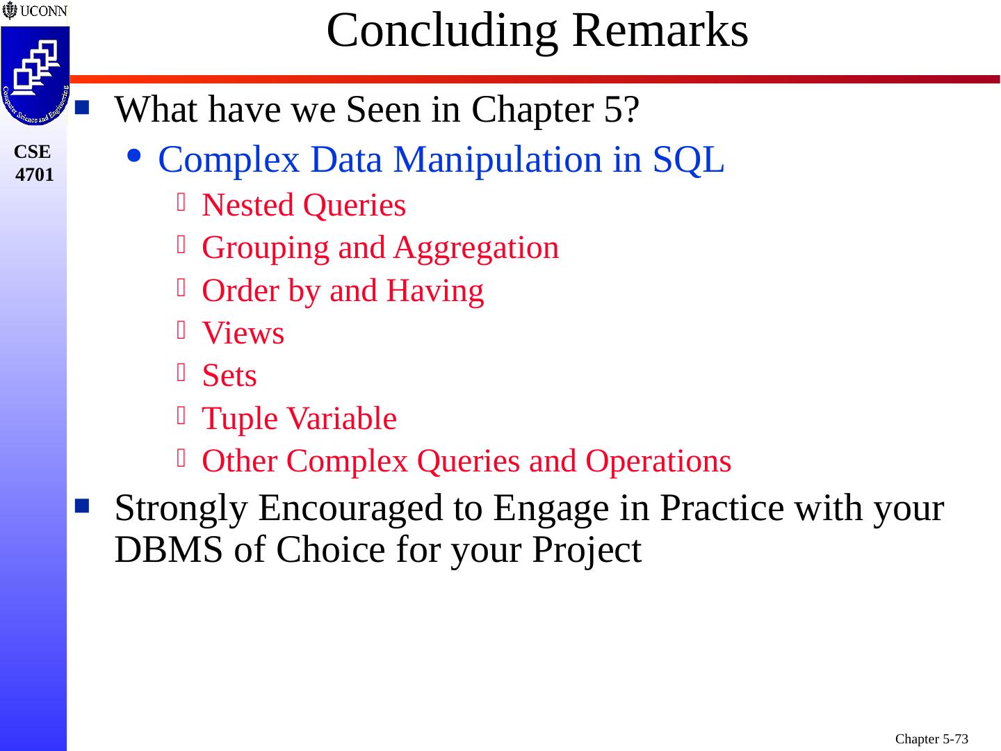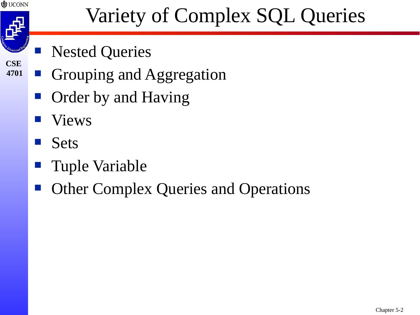 1 .Chapter 5 6e & 8 5e: Complex SQL Prof. Steven A. Demurjian, Sr. Computer Science & Engineering Department The University of Connecticut 191 Auditorium Road, Box U-155 Storrs, CT 06269-3155 steve@engr.uconn.edu http://www.engr.uconn.edu/~steve (860) 486 - 4818 About one third of these slides are being used with the permission of Dr. Ling Lui, Associate Professor, College of Computing, Georgia Tech. About one-half of these slides have been adapted from the AWL web site for the textbook.