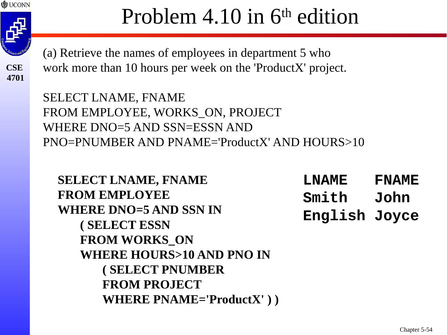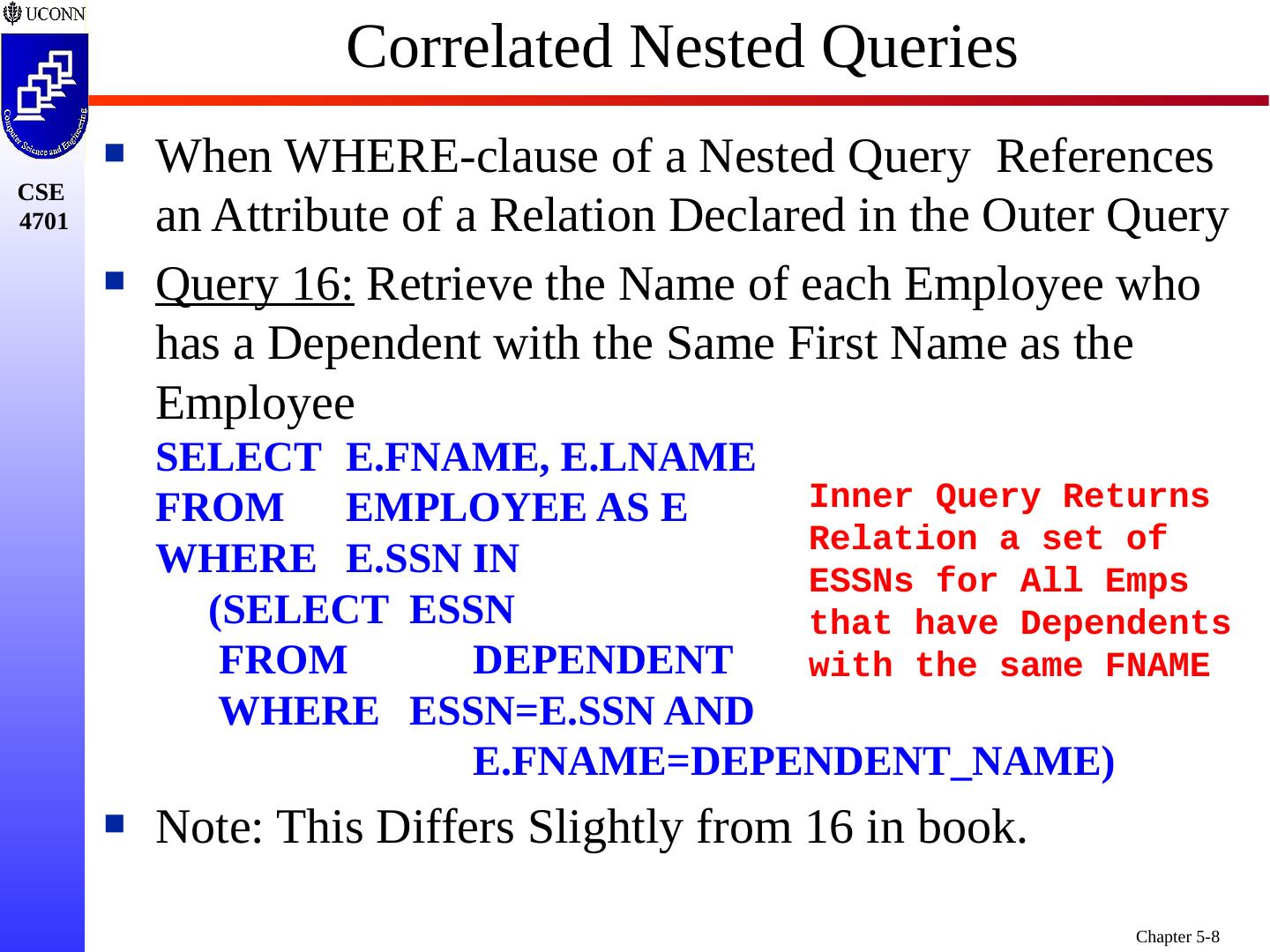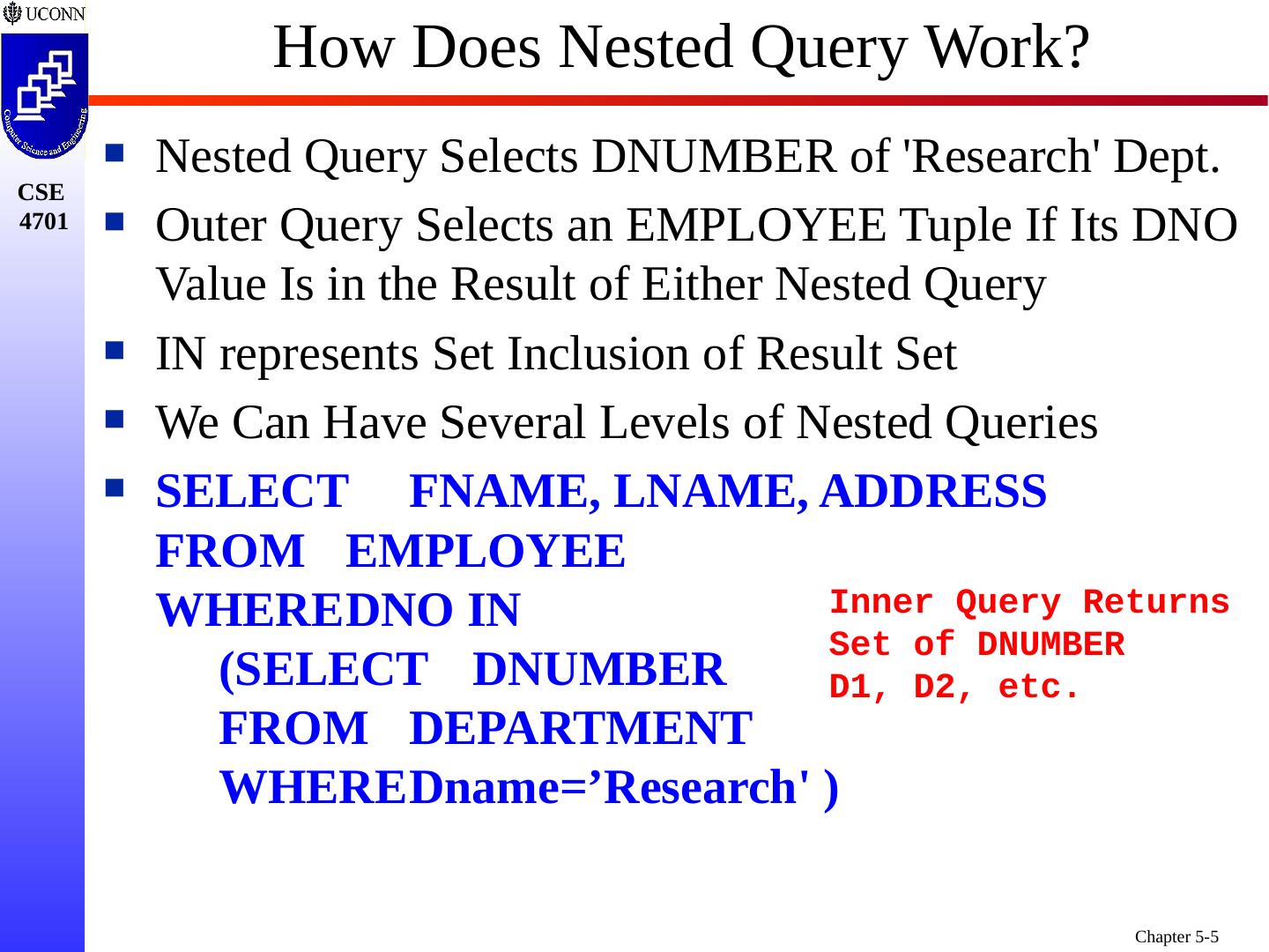 4 .Nested Queries SQL SELECT Nested Query is Specified within WHERE-clause of another Query (the Outer Query ) Query 1A: Retrieve the Name and Address of all Employees who Work for the Research Department SELECT FNAME, LNAME, ADDRESS FROM EMPLOYEE WHERE DNO IN (SELECT DNUMBER FROM DEPARTMENT WHERE DNAME=Research ) Note: This Reformulates Earlier Query 1 (prior slide)