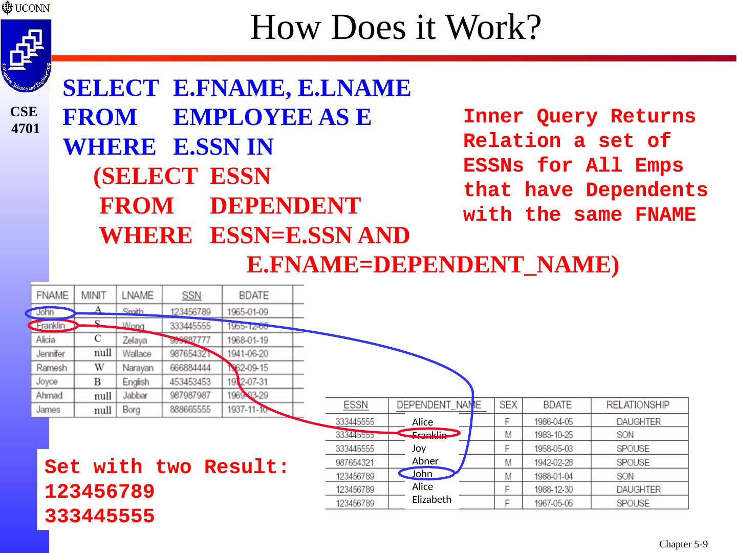 9 .How Does it Work? SELECT E.FNAME, E.LNAME FROM EMPLOYEE AS E WHERE E.SSN IN (SELECT ESSN FROM DEPENDENT WHERE ESSN=E.SSN AND E.FNAME=DEPENDENT_NAME ) Inner Query Returns Relation a set of ESSNs for All Emps that have Dependents with the same FNAME Alice Franklin Joy Abner John Alice Elizabeth Set with two Result: 123456789 333445555