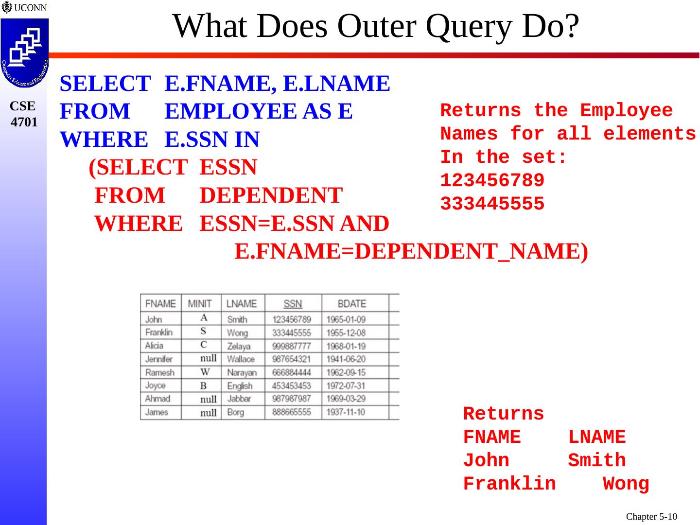 10 .What Does Outer Query Do? SELECT E.FNAME, E.LNAME FROM EMPLOYEE AS E WHERE E.SSN IN (SELECT ESSN FROM DEPENDENT WHERE ESSN=E.SSN AND E.FNAME=DEPENDENT_NAME ) Returns the Employee Names for all elements In the set: 123456789 333445555 Returns FNAME LNAME John Smith Franklin Wong