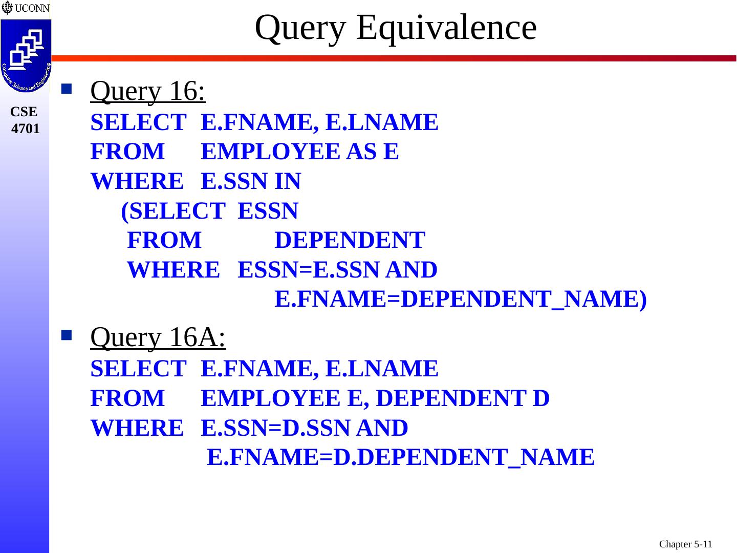 11 .Query Equivalence Query 16: SELECT E.FNAME, E.LNAME FROM EMPLOYEE AS E WHERE E.SSN IN (SELECT ESSN FROM DEPENDENT WHERE ESSN=E.SSN AND E.FNAME=DEPENDENT_NAME) Query 16A: SELECT E.FNAME, E.LNAME FROM EMPLOYEE E, DEPENDENT D WHERE E.SSN=D.SSN AND E.FNAME=D.DEPENDENT_NAME