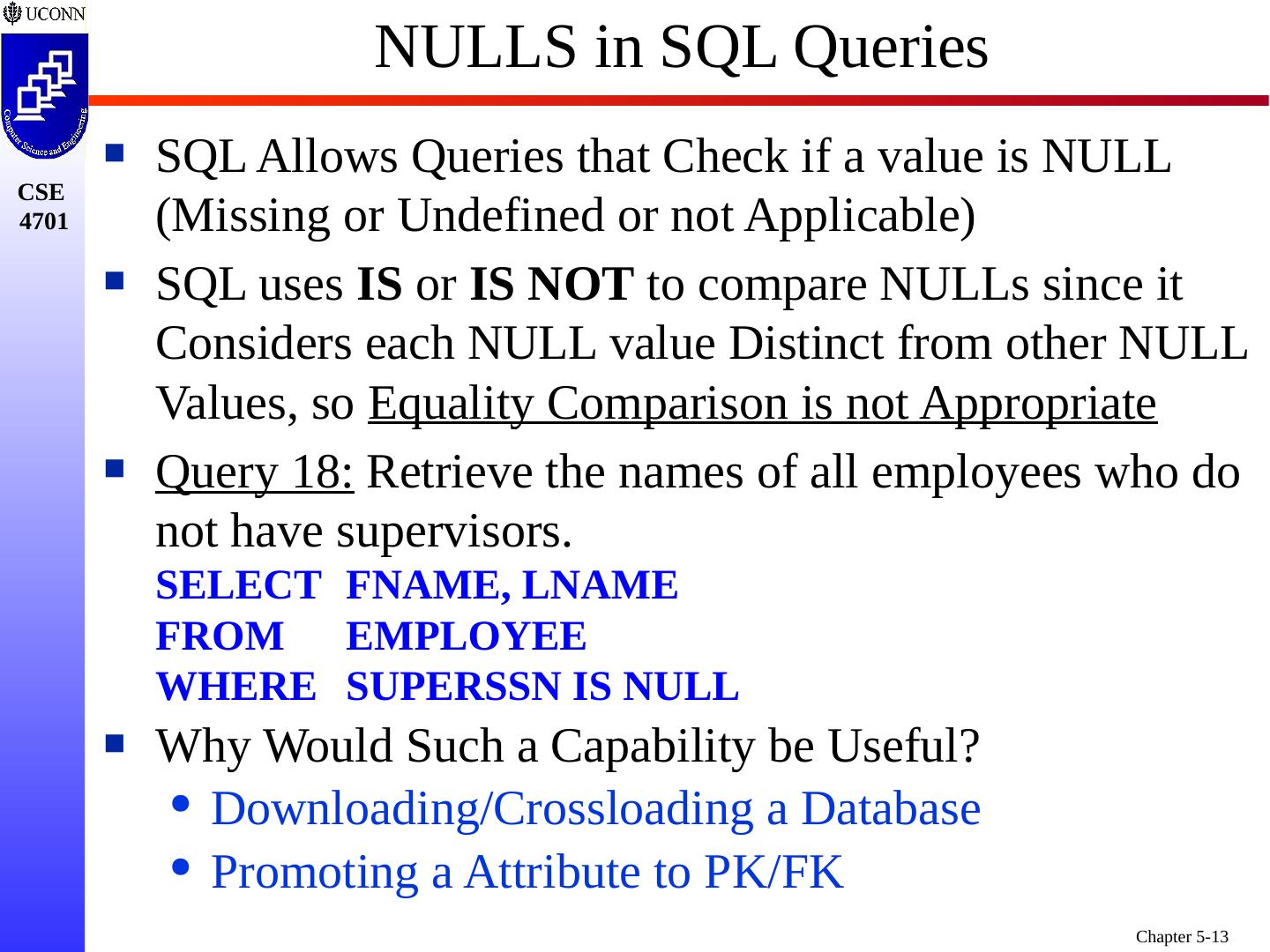 13 .NULLS in SQL Queries SQL Allows Queries that Check if a value is NULL (Missing or Undefined or not Applicable) SQL uses IS or IS NOT to compare NULLs since it Considers each NULL value Distinct from other NULL Values, so Equality Comparison is not Appropriate Query 18: Retrieve the names of all employees who do not have supervisors. SELECT FNAME, LNAME FROM EMPLOYEE WHERE SUPERSSN IS NULL Why Would Such a Capability be Useful? Downloading/Crossloading a Database Promoting a Attribute to PK/FK