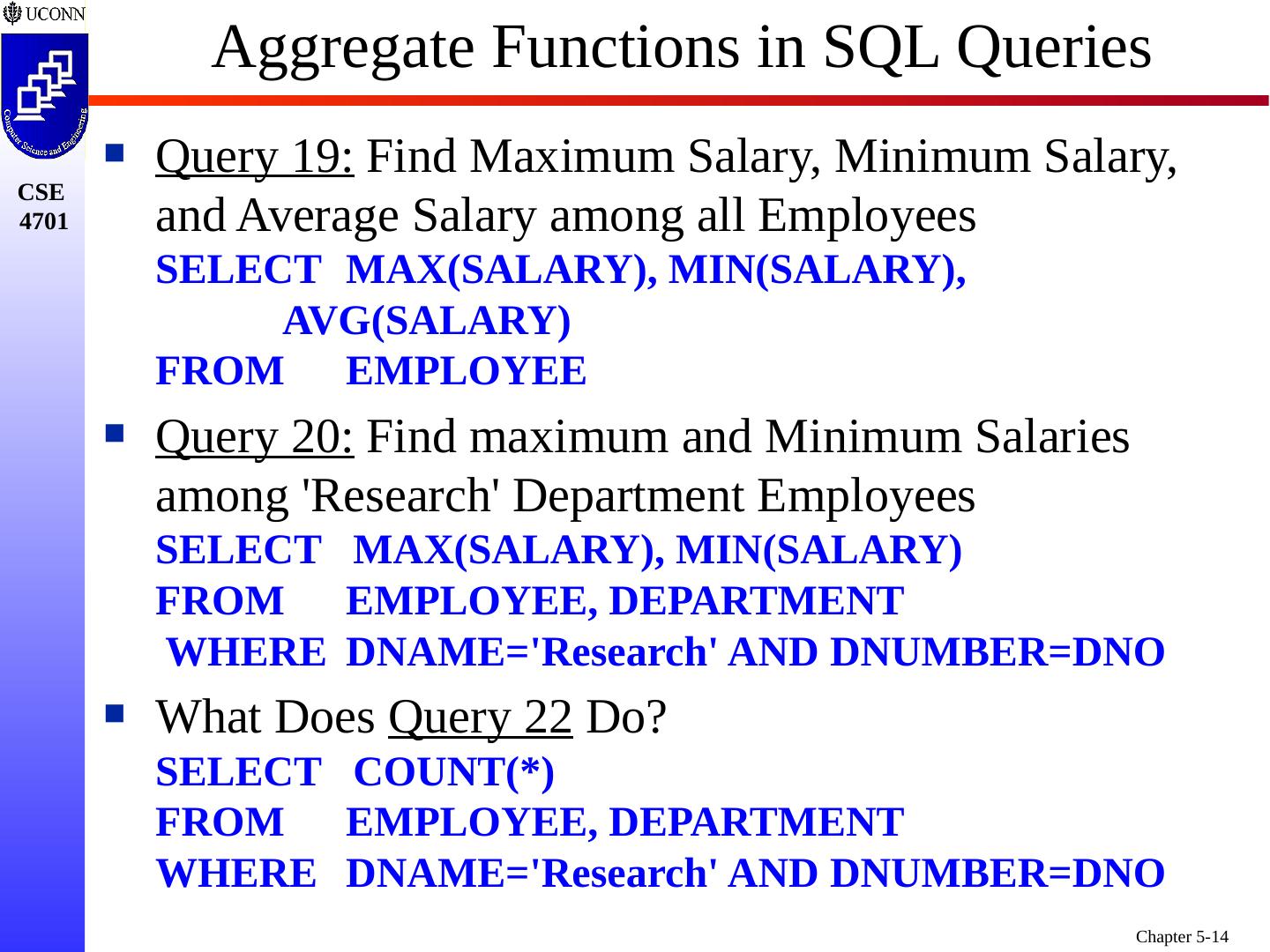 14 .Aggregate Functions in SQL Queries Query 19: Find Maximum Salary, Minimum Salary, and Average Salary among all Employees SELECT MAX(SALARY), MIN(SALARY), AVG(SALARY) FROM EMPLOYEE Query 20: Find maximum and Minimum Salaries among Research Department Employees SELECT MAX(SALARY), MIN(SALARY) FROM EMPLOYEE, DEPARTMENT WHERE DNAME=Research AND DNUMBER=DNO What Does Query 22 Do? SELECT COUNT(*) FROM EMPLOYEE, DEPARTMENT WHERE DNAME=Research AND DNUMBER=DNO
