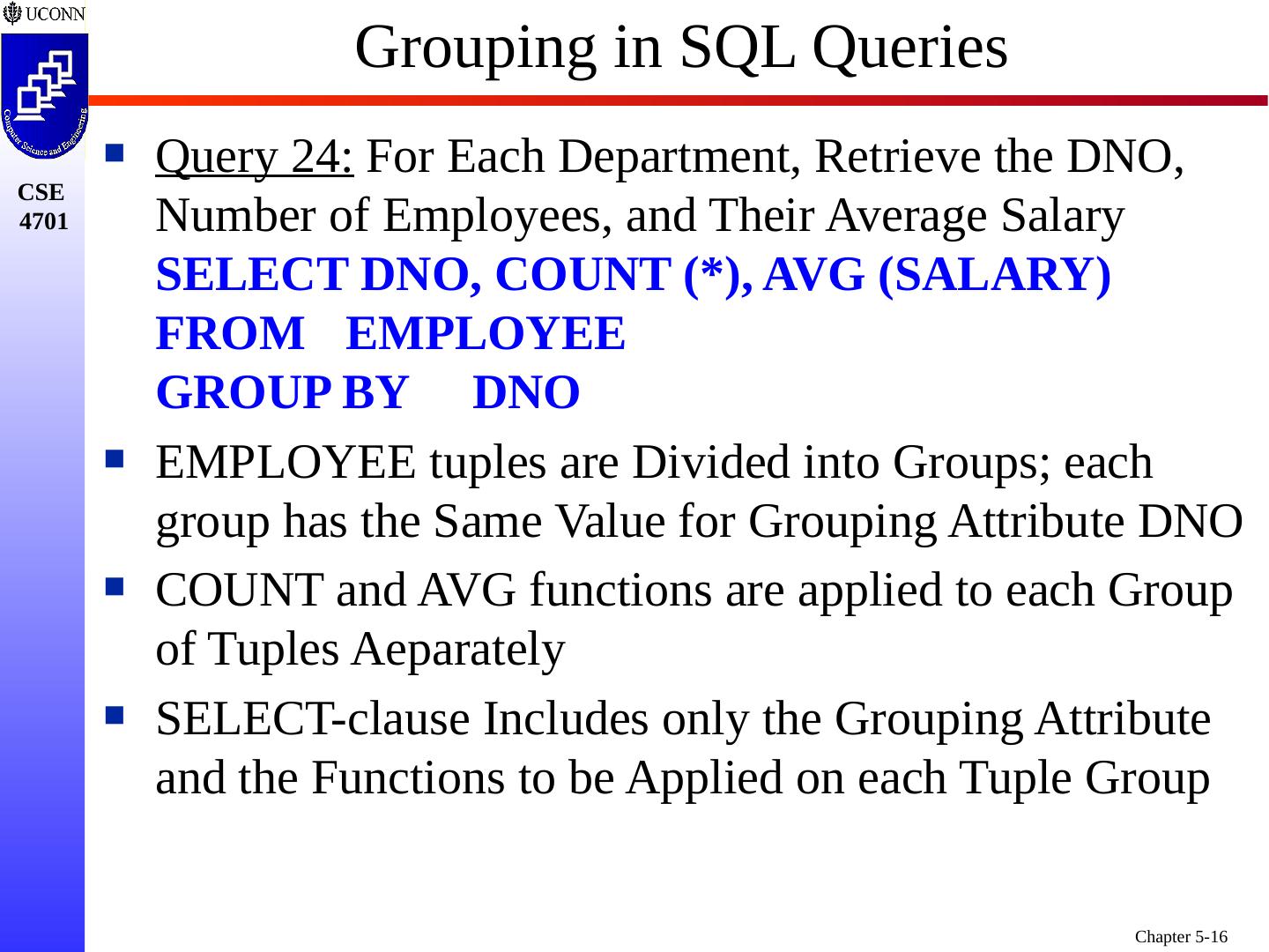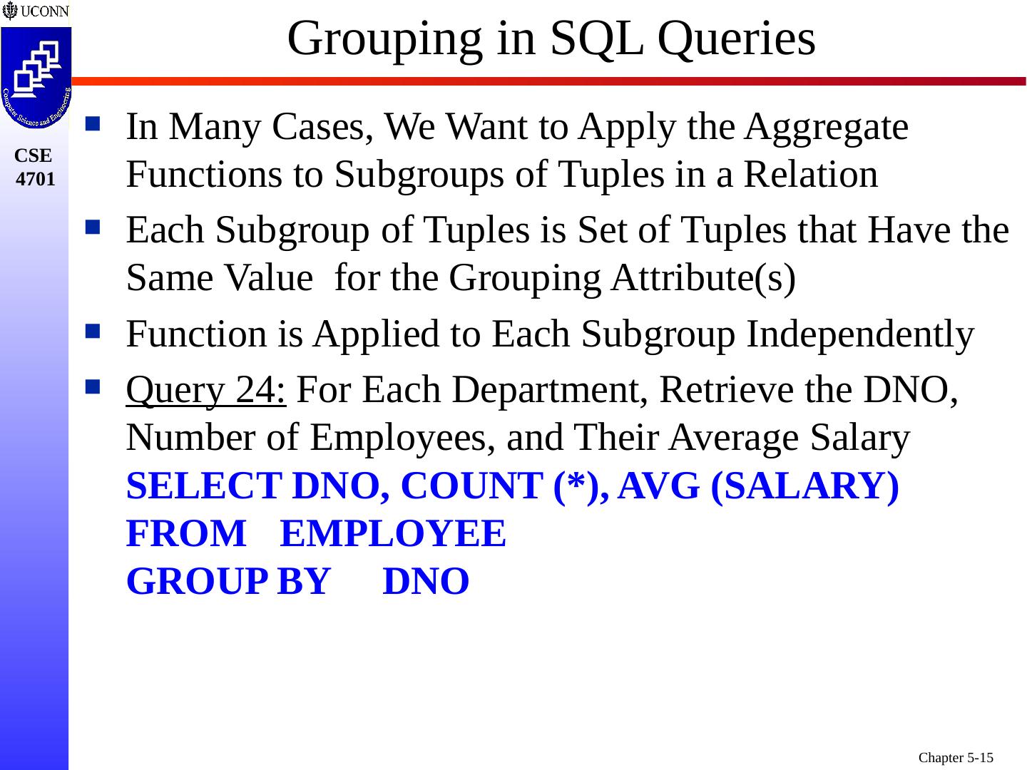 15 .Grouping in SQL Queries In Many Cases, We Want to Apply the Aggregate Functions to Subgroups of Tuples in a Relation Each Subgroup of Tuples is Set of Tuples that Have the Same Value for the Grouping Attribute(s) Function is Applied to Each Subgroup Independently Query 24: For Each Department, Retrieve the DNO, Number of Employees, and Their Average Salary SELECT DNO, COUNT (*), AVG (SALARY) FROM EMPLOYEE GROUP BY DNO