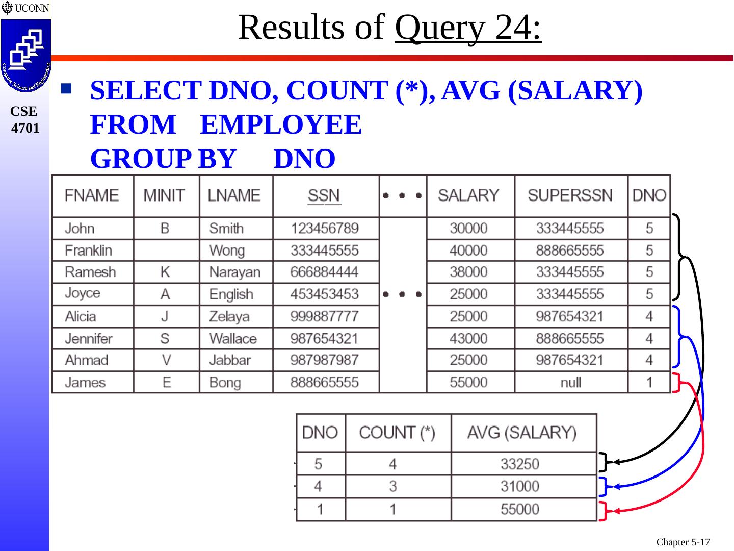 17 .Results of Query 24: SELECT DNO, COUNT (*), AVG (SALARY) FROM EMPLOYEE GROUP BY DNO