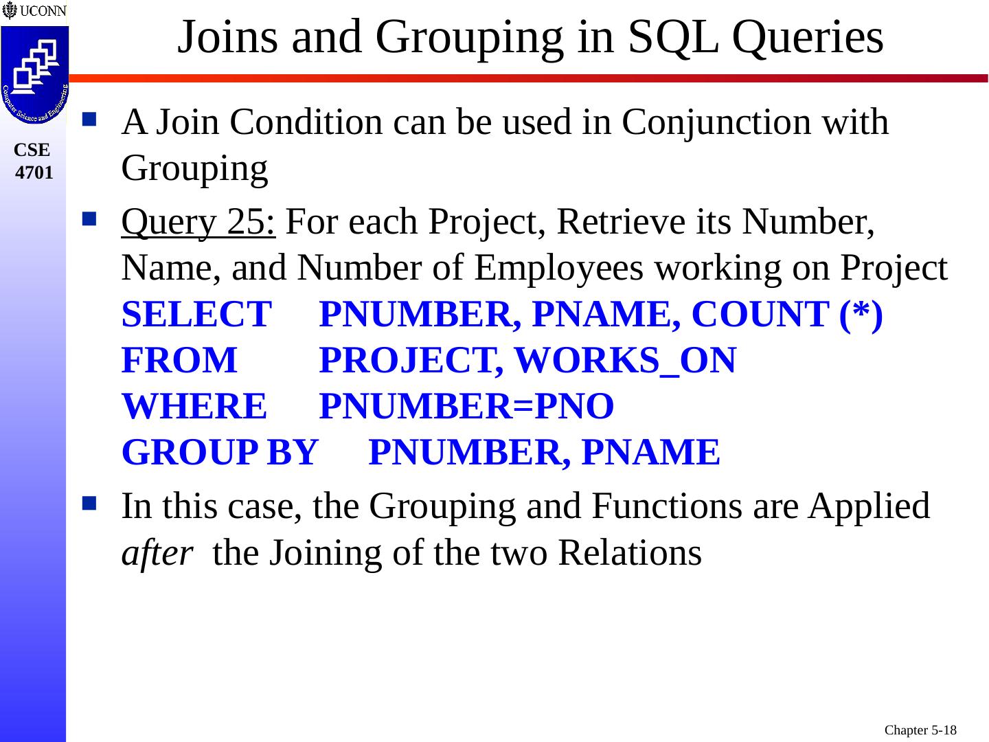 18 .Joins and Grouping in SQL Queries A Join Condition can be used in Conjunction with Grouping Query 25: For each Project, Retrieve its Number, Name, and Number of Employees working on Project SELECT PNUMBER, PNAME, COUNT (*) FROM PROJECT, WORKS_ON WHERE PNUMBER=PNO GROUP BY PNUMBER, PNAME In this case, the Grouping and Functions are Applied after the Joining of the two Relations