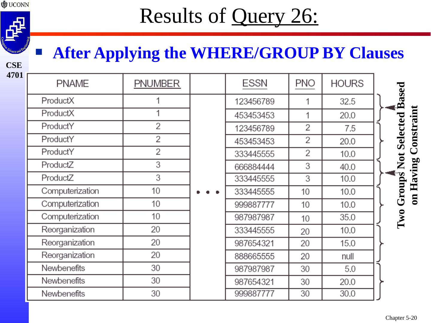 20 .Results of Query 26: After Applying the WHERE/GROUP BY Clauses Two Groups Not Selected Based on Having Constraint