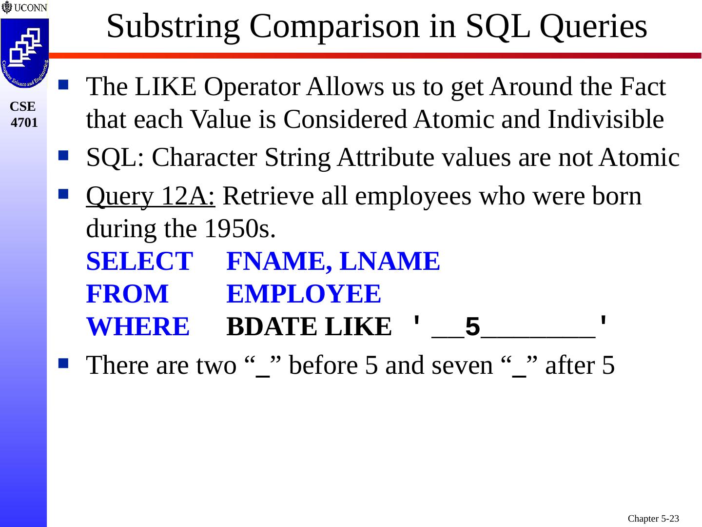 23 .Substring Comparison in SQL Queries The LIKE Operator Allows us to get Around the Fact that each Value is Considered Atomic and Indivisible SQL: Character String Attribute values are not Atomic Query 12A: Retrieve all employees who were born during the 1950s. SELECT FNAME, LNAME FROM EMPLOYEE WHERE BDATE LIKE __5_______ There are two “ _ ” before 5 and seven “ _ ” after 5