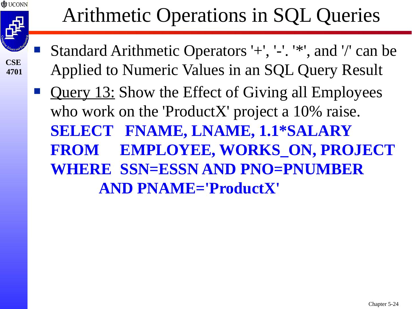 24 .Arithmetic Operations in SQL Queries Standard Arithmetic Operators +, -. *, and / can be Applied to Numeric Values in an SQL Query Result Query 13 : Show the Effect of Giving all Employees who work on the ProductX project a 10% raise. SELECT FNAME, LNAME, 1.1*SALARY FROM EMPLOYEE, WORKS_ON, PROJECT WHERE SSN=ESSN AND PNO=PNUMBER AND PNAME=ProductX