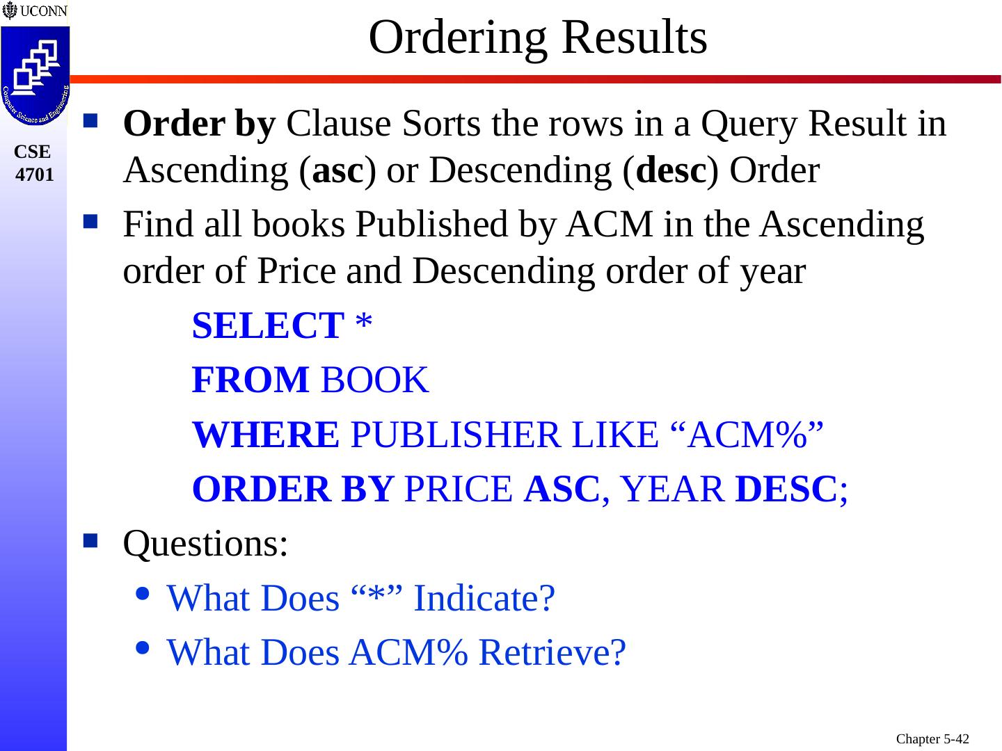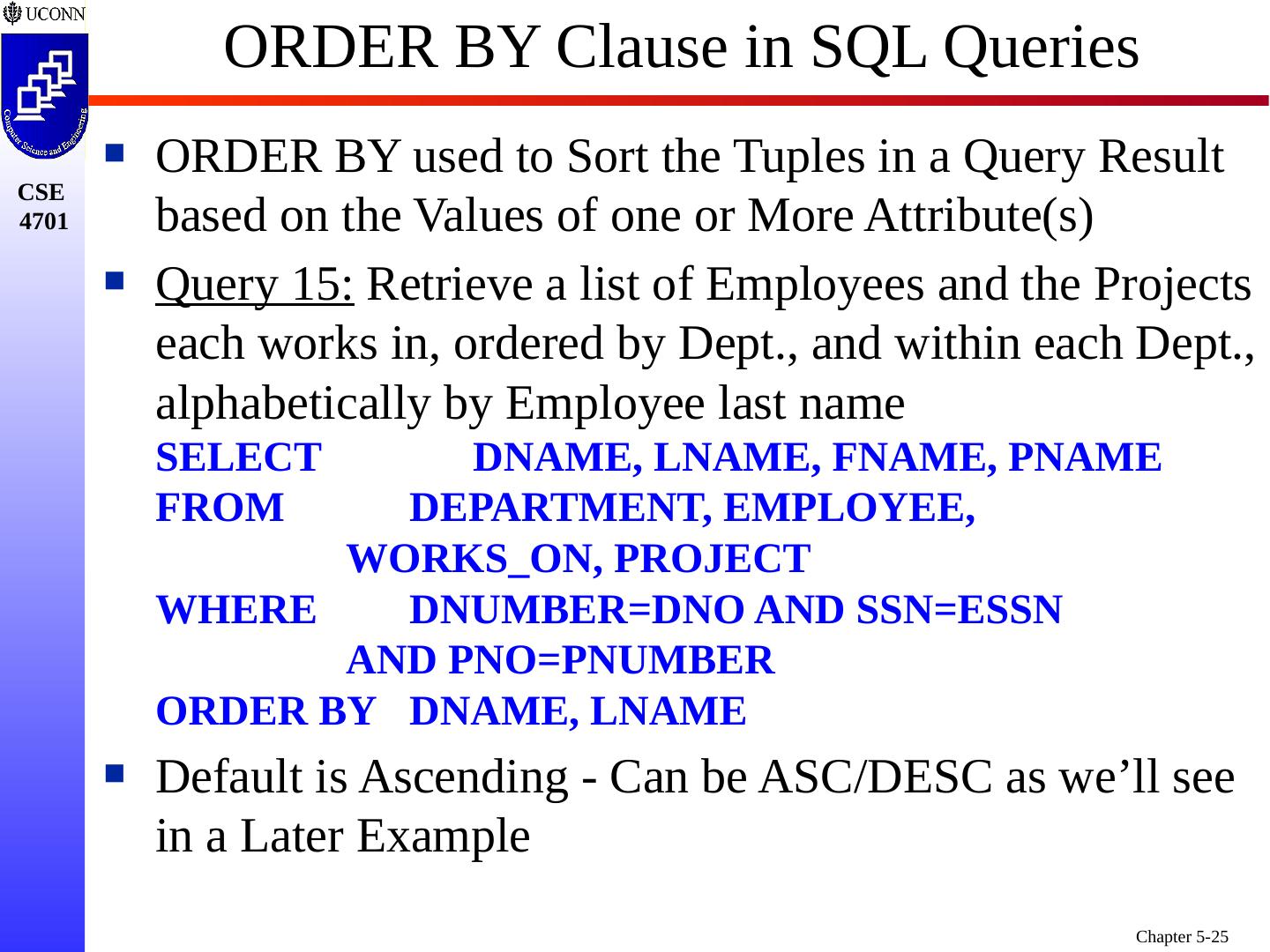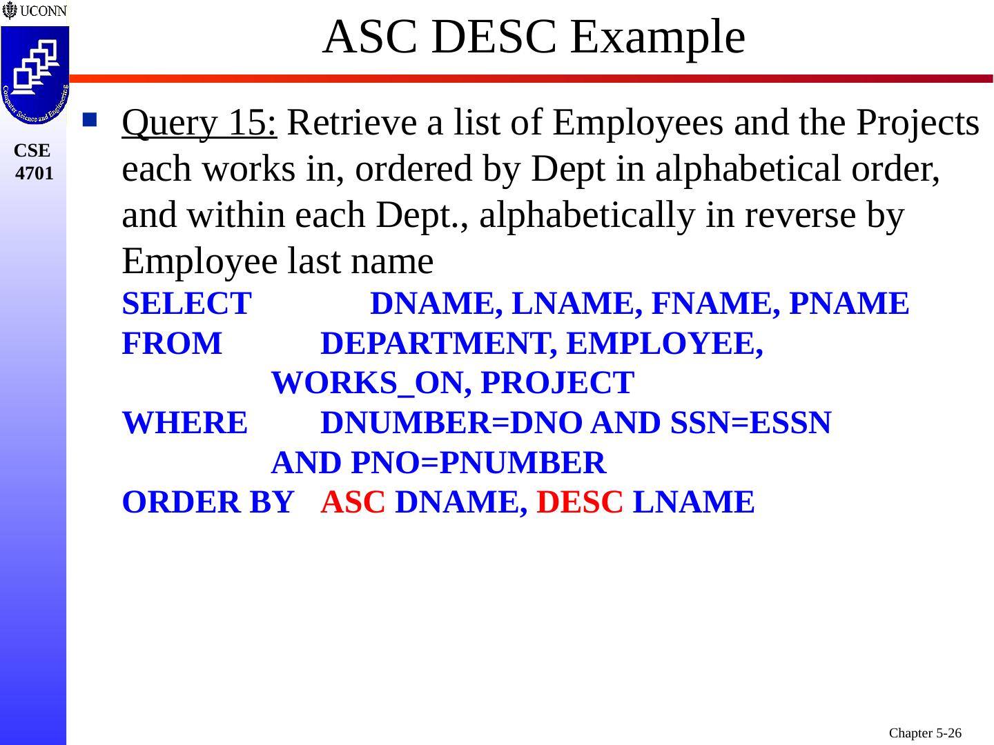 26 .ASC DESC Example Query 15 : Retrieve a list of Employees and the Projects each works in, ordered by Dept in alphabetical order, and within each Dept., alphabetically in reverse by Employee last name SELECT DNAME, LNAME, FNAME, PNAME FROM DEPARTMENT, EMPLOYEE, WORKS_ON, PROJECT WHERE DNUMBER=DNO AND SSN=ESSN AND PNO=PNUMBER ORDER BY ASC DNAME , DESC LNAME