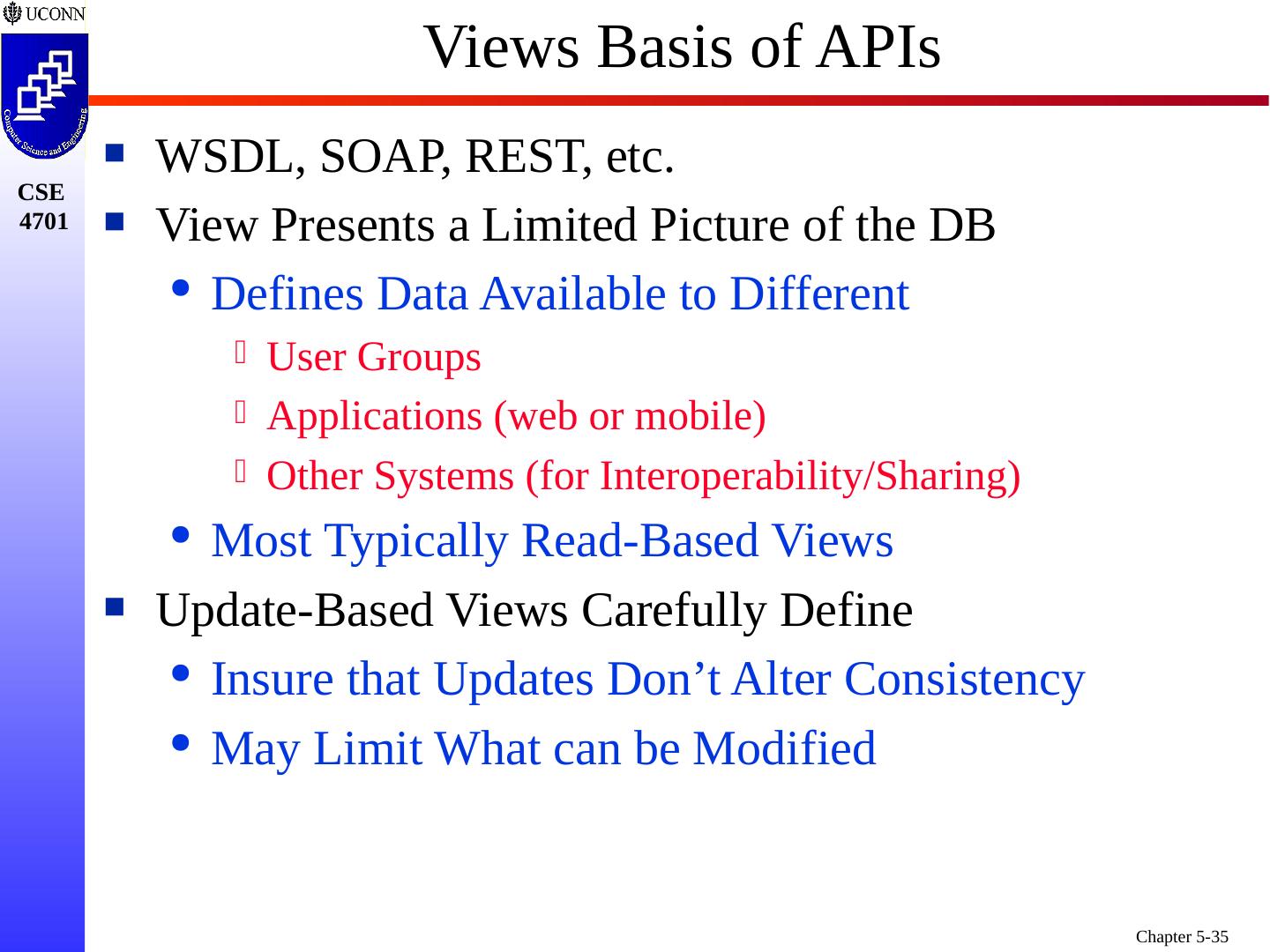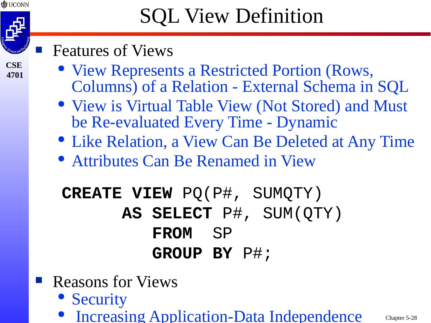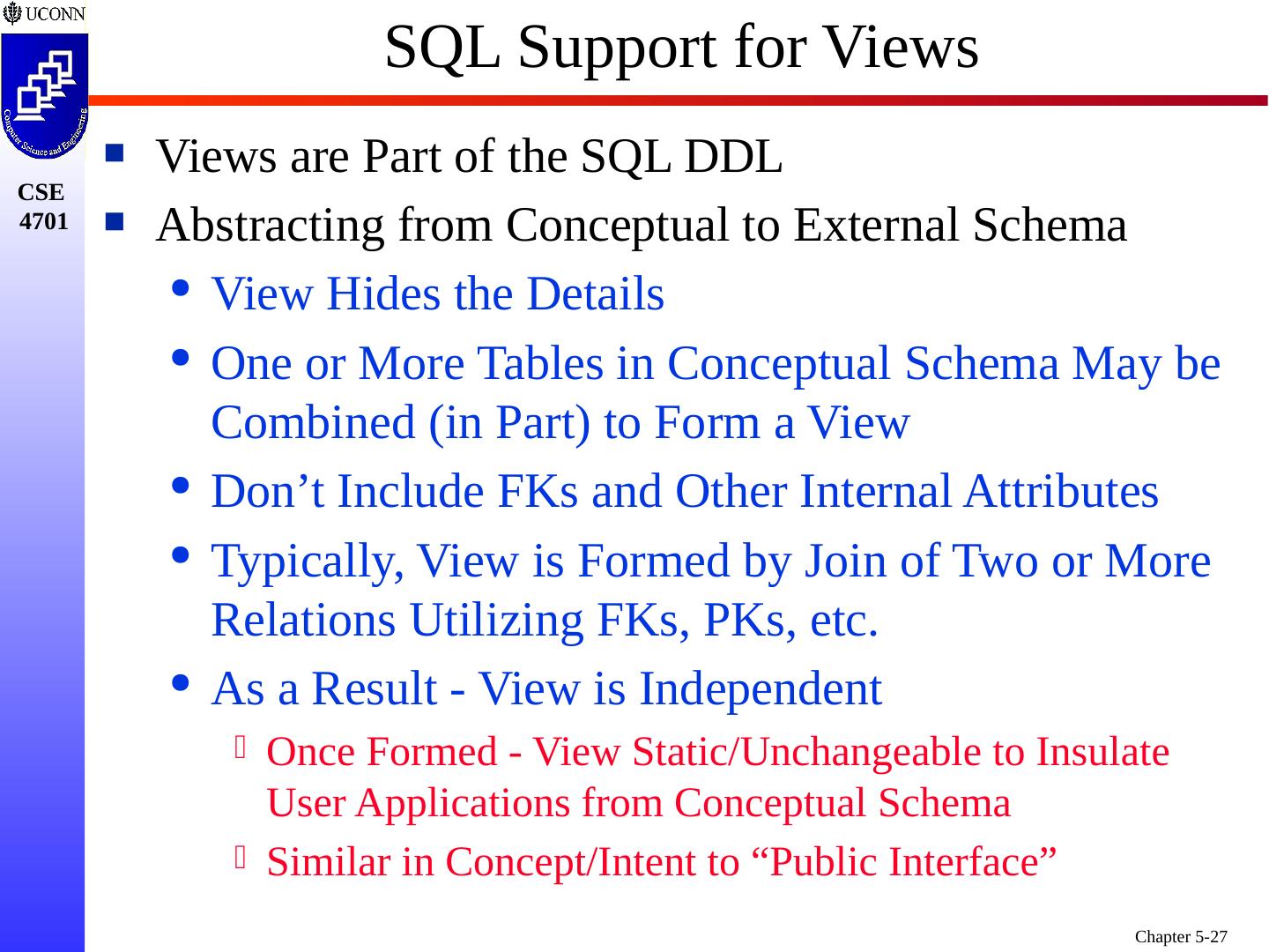 27 .SQL Support for Views Views are Part of the SQL DDL Abstracting from Conceptual to External Schema View Hides the Details One or More Tables in Conceptual Schema May be Combined (in Part) to Form a View Don’t Include FKs and Other Internal Attributes Typically, View is Formed by Join of Two or More Relations Utilizing FKs, PKs, etc. As a Result - View is Independent Once Formed - View Static/Unchangeable to Insulate User Applications from Conceptual Schema Similar in Concept/Intent to “Public Interface”
