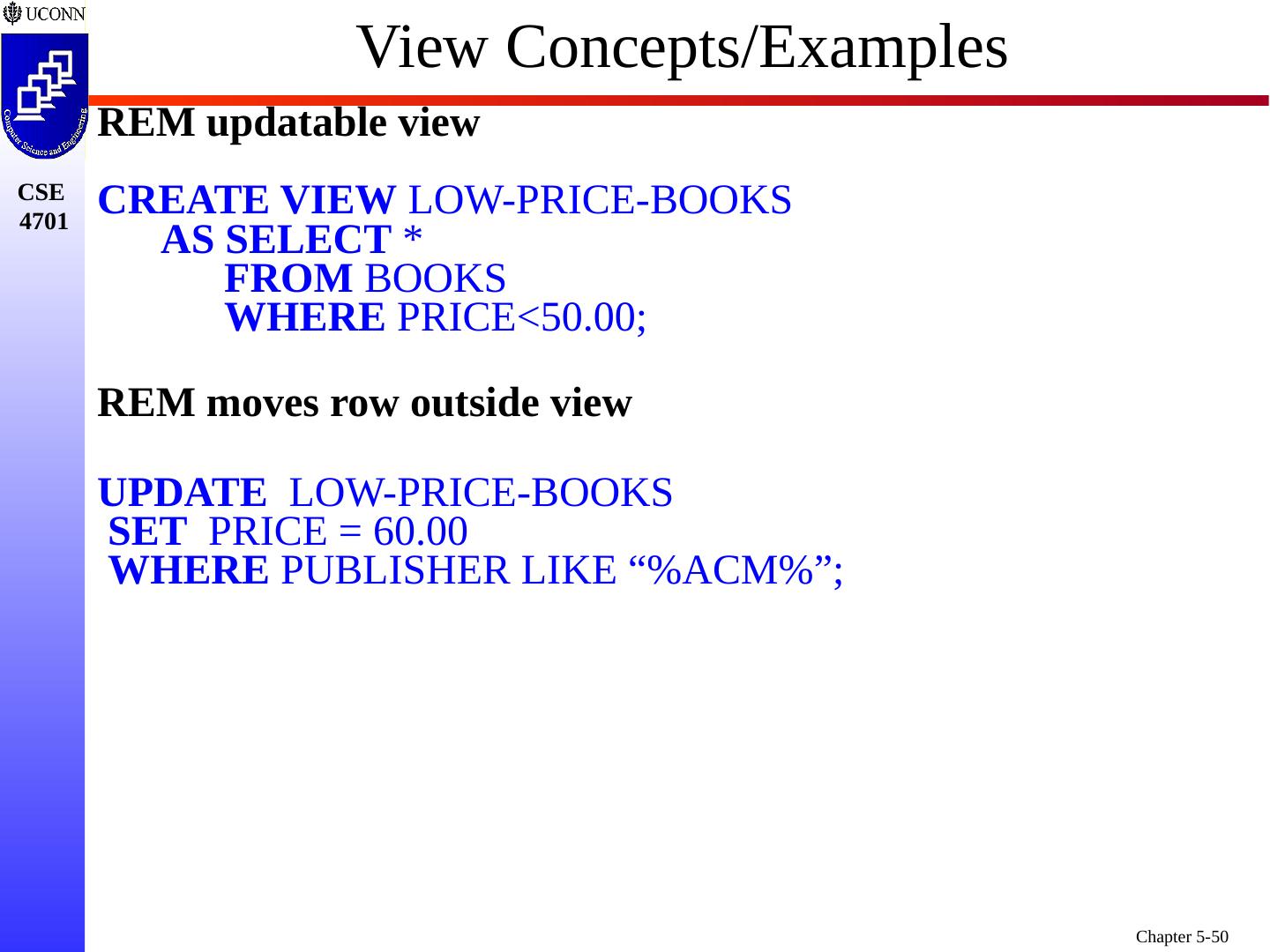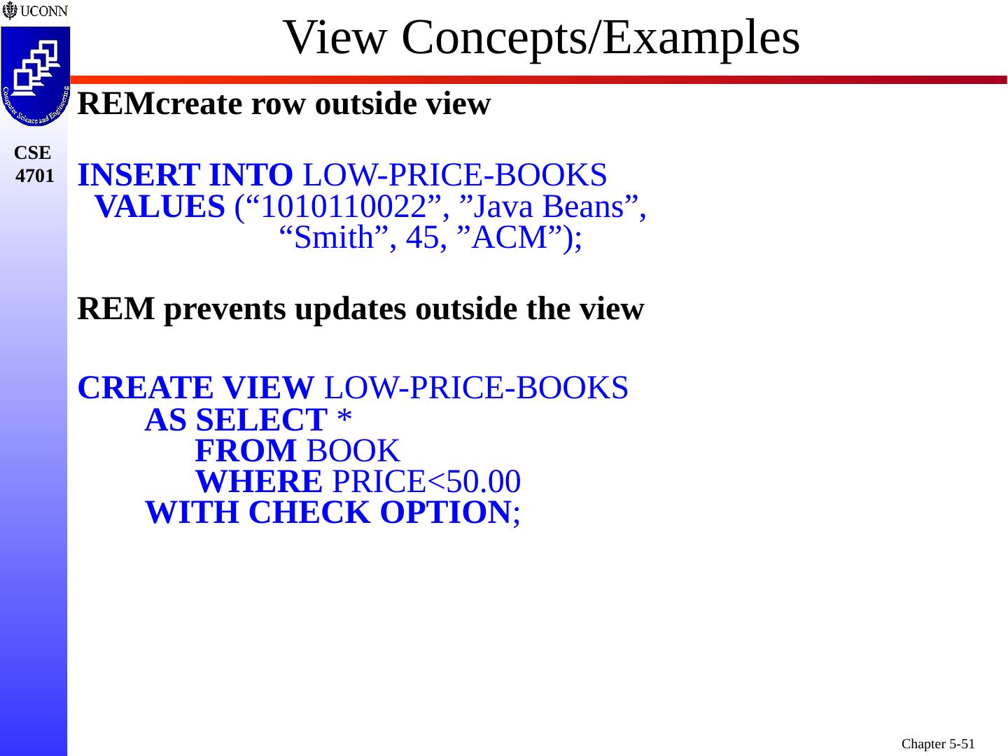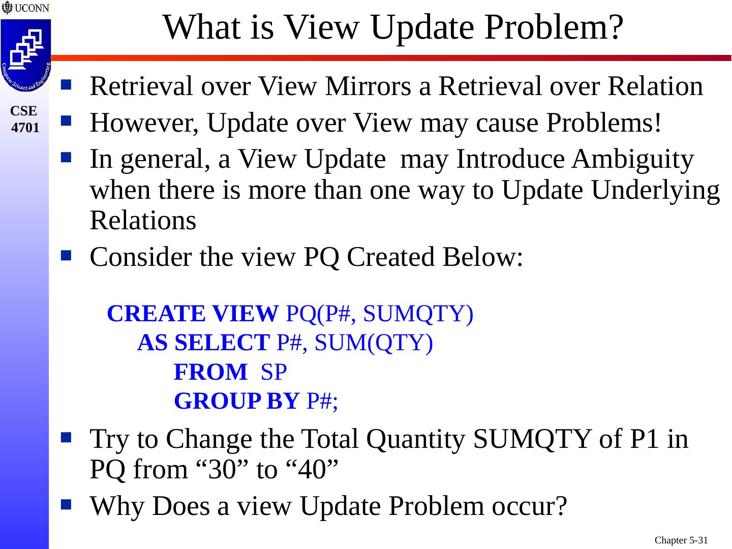 27 .SQL Support for Views Views are Part of the SQL DDL Abstracting from Conceptual to External Schema View Hides the Details One or More Tables in Conceptual Schema May be Combined (in Part) to Form a View Don’t Include FKs and Other Internal Attributes Typically, View is Formed by Join of Two or More Relations Utilizing FKs, PKs, etc. As a Result - View is Independent Once Formed - View Static/Unchangeable to Insulate User Applications from Conceptual Schema Similar in Concept/Intent to “Public Interface”