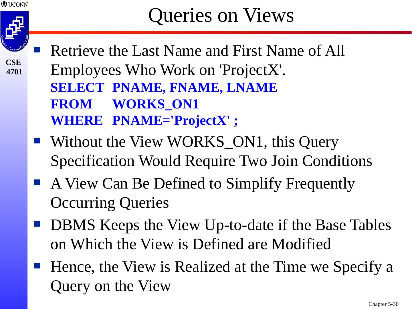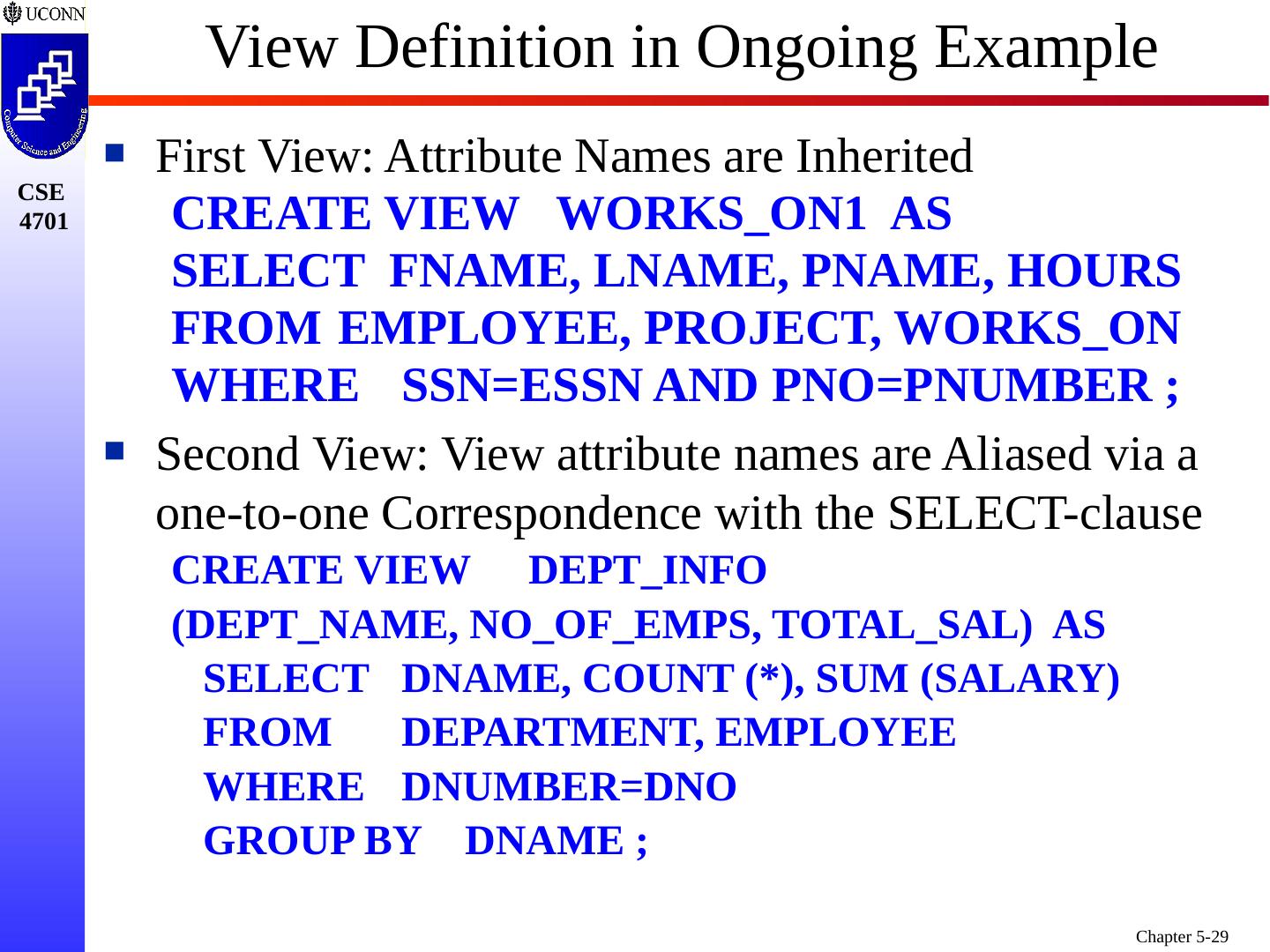 29 .First View: Attribute Names are Inherited CREATE VIEW WORKS_ON1 AS SELECT FNAME, LNAME, PNAME, HOURS FROM EMPLOYEE, PROJECT, WORKS_ON WHERE SSN=ESSN AND PNO=PNUMBER ; Second View: View attribute names are Aliased via a one-to-one Correspondence with the SELECT-clause CREATE VIEW DEPT_INFO (DEPT_NAME, NO_OF_EMPS, TOTAL_SAL) AS SELECT DNAME, COUNT (*), SUM (SALARY) FROM DEPARTMENT, EMPLOYEE WHERE DNUMBER=DNO GROUP BY DNAME ; View Definition in Ongoing Example