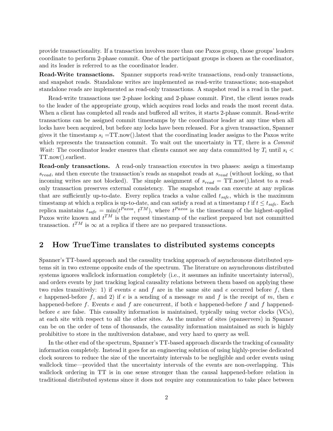 2 .provide transactionality. If a transaction involves more than one Paxos group, those groups’ leaders coordinate to perform 2-phase commit. One of the participant groups is chosen as the coordinator, and its leader is referred to as the coordinator leader. Read-Write transactions. Spanner supports read-write transactions, read-only transactions, and snapshot reads. Standalone writes are implemented as read-write transactions; non-snapshot standalone reads are implemented as read-only transactions. A snapshot read is a read in the past. Read-write transactions use 2-phase locking and 2-phase commit. First, the client issues reads to the leader of the appropriate group, which acquires read locks and reads the most recent data. When a client has completed all reads and buffered all writes, it starts 2-phase commit. Read-write transactions can be assigned commit timestamps by the coordinator leader at any time when all locks have been acquired, but before any locks have been released. For a given transaction, Spanner gives it the timestamp si =TT.now().latest that the coordinating leader assigns to the Paxos write which represents the transaction commit. To wait out the uncertainty in TT, there is a Commit Wait: The coordinator leader ensures that clients cannot see any data committed by Ti until si < TT.now().earliest. Read-only transactions. A read-only transaction executes in two phases: assign a timestamp sread , and then execute the transaction’s reads as snapshot reads at sread (without locking, so that incoming writes are not blocked). The simple assignment of sread = TT.now().latest to a read- only transaction preserves external consistency. The snapshot reads can execute at any replicas that are sufficiently up-to-date. Every replica tracks a value called tsafe , which is the maximum timestamp at which a replica is up-to-date, and can satisfy a read at a timestamp t if t ≤ tsafe . Each replica maintains tsafe = min(tP axos , tT M ), where tP axos is the timestamp of the highest-applied Paxos write known and tT M is the request timestamp of the earliest prepared but not committed transaction. tT M is ∞ at a replica if there are no prepared transactions. 2 How TrueTime translates to distributed systems concepts Spanner’s TT-based approach and the causality tracking approach of asynchronous distributed sys- tems sit in two extreme opposite ends of the spectrum. The literature on asynchronous distributed systems ignores wallclock information completely (i.e., it assumes an infinite uncertainty interval), and orders events by just tracking logical causality relations between them based on applying these two rules transitively: 1) if events e and f are in the same site and e occurred before f , then e happened-before f , and 2) if e is a sending of a message m and f is the receipt of m, then e happened-before f . Events e and f are concurrent, if both e happened-before f and f happened- before e are false. This causality information is maintained, typically using vector clocks (VCs), at each site with respect to all the other sites. As the number of sites (spanservers) in Spanner can be on the order of tens of thousands, the causality information maintained as such is highly prohibitive to store in the multiversion database, and very hard to query as well. In the other end of the spectrum, Spanner’s TT-based approach discards the tracking of causality information completely. Instead it goes for an engineering solution of using highly-precise dedicated clock sources to reduce the size of the uncertainty intervals to be negligible and order events using wallclock time—provided that the uncertainty intervals of the events are non-overlapping. This wallclock ordering in TT is in one sense stronger than the causal happened-before relation in traditional distributed systems since it does not require any communication to take place between 2