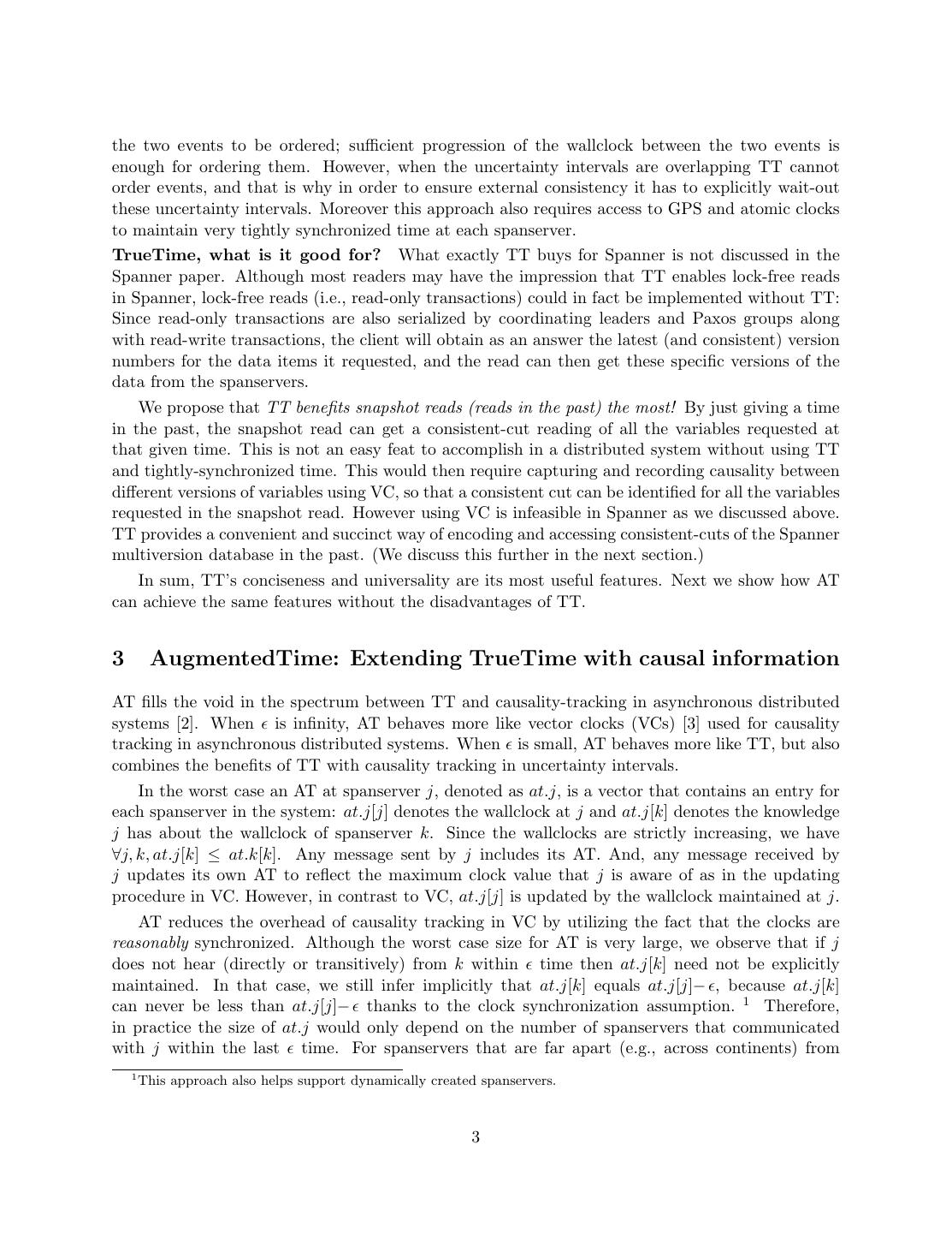 3 .the two events to be ordered; sufficient progression of the wallclock between the two events is enough for ordering them. However, when the uncertainty intervals are overlapping TT cannot order events, and that is why in order to ensure external consistency it has to explicitly wait-out these uncertainty intervals. Moreover this approach also requires access to GPS and atomic clocks to maintain very tightly synchronized time at each spanserver. TrueTime, what is it good for? What exactly TT buys for Spanner is not discussed in the Spanner paper. Although most readers may have the impression that TT enables lock-free reads in Spanner, lock-free reads (i.e., read-only transactions) could in fact be implemented without TT: Since read-only transactions are also serialized by coordinating leaders and Paxos groups along with read-write transactions, the client will obtain as an answer the latest (and consistent) version numbers for the data items it requested, and the read can then get these specific versions of the data from the spanservers. We propose that TT benefits snapshot reads (reads in the past) the most! By just giving a time in the past, the snapshot read can get a consistent-cut reading of all the variables requested at that given time. This is not an easy feat to accomplish in a distributed system without using TT and tightly-synchronized time. This would then require capturing and recording causality between different versions of variables using VC, so that a consistent cut can be identified for all the variables requested in the snapshot read. However using VC is infeasible in Spanner as we discussed above. TT provides a convenient and succinct way of encoding and accessing consistent-cuts of the Spanner multiversion database in the past. (We discuss this further in the next section.) In sum, TT’s conciseness and universality are its most useful features. Next we show how AT can achieve the same features without the disadvantages of TT. 3 AugmentedTime: Extending TrueTime with causal information AT fills the void in the spectrum between TT and causality-tracking in asynchronous distributed systems [2]. When is infinity, AT behaves more like vector clocks (VCs) [3] used for causality tracking in asynchronous distributed systems. When is small, AT behaves more like TT, but also combines the benefits of TT with causality tracking in uncertainty intervals. In the worst case an AT at spanserver j, denoted as at.j, is a vector that contains an entry for each spanserver in the system: at.j[j] denotes the wallclock at j and at.j[k] denotes the knowledge j has about the wallclock of spanserver k. Since the wallclocks are strictly increasing, we have ∀j, k, at.j[k] ≤ at.k[k]. Any message sent by j includes its AT. And, any message received by j updates its own AT to reflect the maximum clock value that j is aware of as in the updating procedure in VC. However, in contrast to VC, at.j[j] is updated by the wallclock maintained at j. AT reduces the overhead of causality tracking in VC by utilizing the fact that the clocks are reasonably synchronized. Although the worst case size for AT is very large, we observe that if j does not hear (directly or transitively) from k within time then at.j[k] need not be explicitly maintained. In that case, we still infer implicitly that at.j[k] equals at.j[j]− , because at.j[k] can never be less than at.j[j]− thanks to the clock synchronization assumption. 1 Therefore, in practice the size of at.j would only depend on the number of spanservers that communicated with j within the last time. For spanservers that are far apart (e.g., across continents) from 1 This approach also helps support dynamically created spanservers. 3