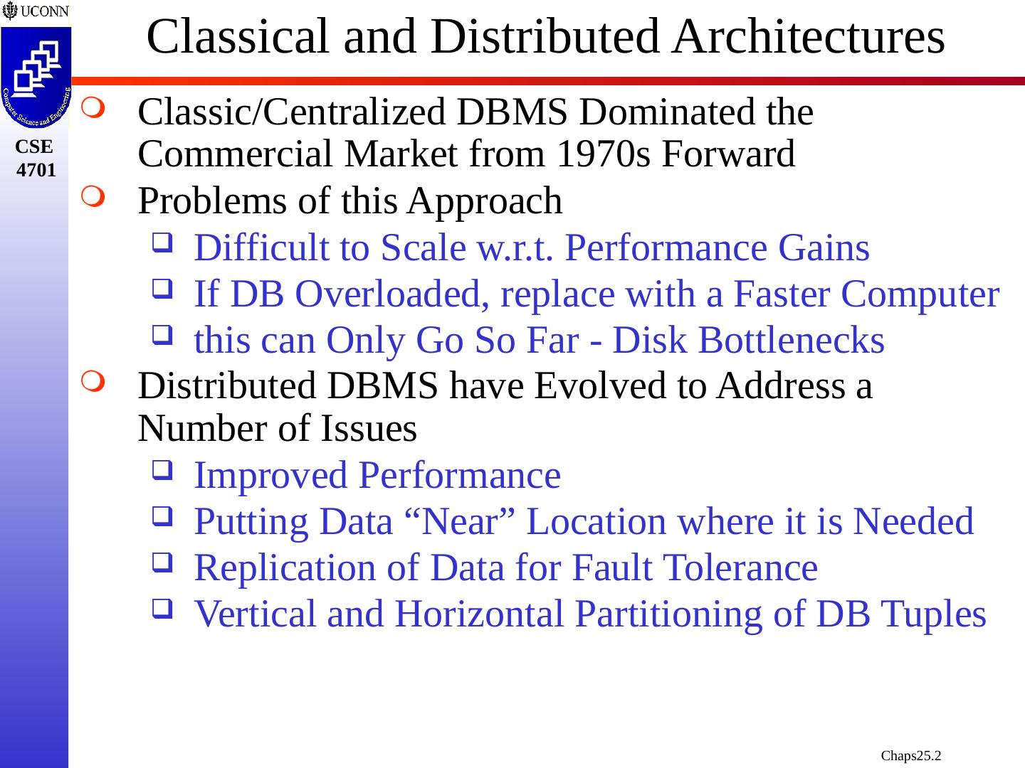2 .Classical and Distributed Architectures Classic/Centralized DBMS Dominated the Commercial Market from 1970s Forward Problems of this Approach Difficult to Scale w.r.t. Performance Gains If DB Overloaded, replace with a Faster Computer this can Only Go So Far - Disk Bottlenecks Distributed DBMS have Evolved to Address a Number of Issues Improved Performance Putting Data “Near” Location where it is Needed Replication of Data for Fault Tolerance Vertical and Horizontal Partitioning of DB Tuples