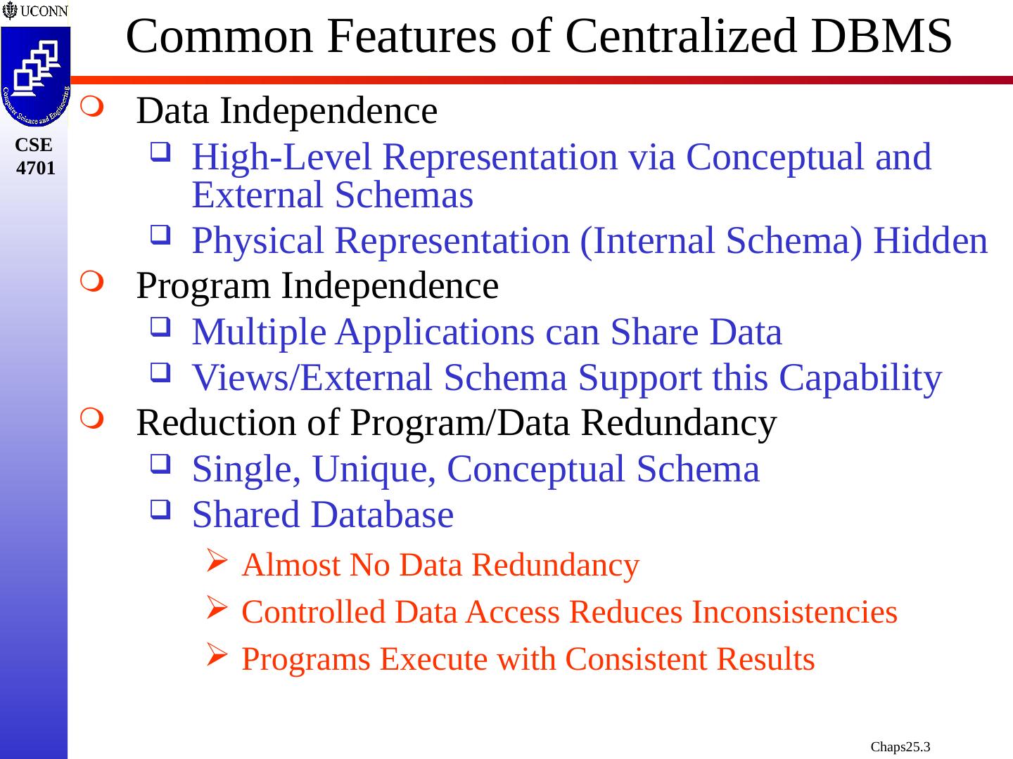 3 .Common Features of Centralized DBMS Data Independence High-Level Representation via Conceptual and External Schemas Physical Representation (Internal Schema) Hidden Program Independence Multiple Applications can Share Data Views/External Schema Support this Capability Reduction of Program/Data Redundancy Single, Unique, Conceptual Schema Shared Database Almost No Data Redundancy Controlled Data Access Reduces Inconsistencies Programs Execute with Consistent Results
