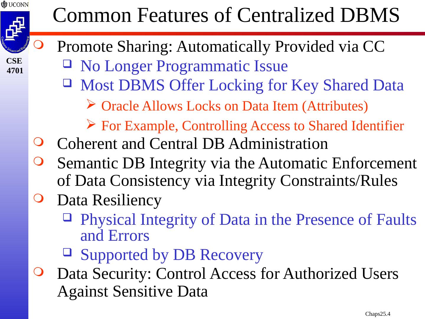 4 .Common Features of Centralized DBMS Promote Sharing: Automatically Provided via CC No Longer Programmatic Issue Most DBMS Offer Locking for Key Shared Data Oracle Allows Locks on Data Item (Attributes) For Example, Controlling Access to Shared Identifier Coherent and Central DB Administration Semantic DB Integrity via the Automatic Enforcement of Data Consistency via Integrity Constraints/Rules Data Resiliency Physical Integrity of Data in the Presence of Faults and Errors Supported by DB Recovery Data Security: Control Access for Authorized Users Against Sensitive Data