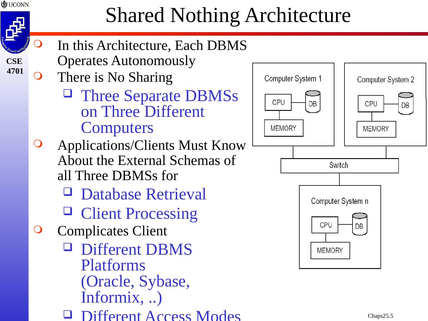 5 .Shared Nothing Architecture In this Architecture, Each DBMS Operates Autonomously There is No Sharing Three Separate DBMSs on Three Different Computers Applications/Clients Must Know About the External Schemas of all Three DBMSs for Database Retrieval Client Processing Complicates Client Different DBMS Platforms (Oracle, Sybase, Informix, ..) Different Access Modes (Query, Embedded, ODBC) Difficult for SWE to Code