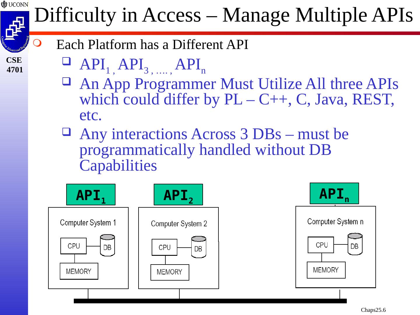6 .Difficulty in Access – Manage Multiple APIs Each Platform has a Different API API 1 , API 3 , …. , API n An App Programmer Must Utilize All three APIs which could differ by PL – C++, C, Java, REST, etc. Any interactions Across 3 DBs – must be programmatically handled without DB Capabilities API 1 API 2 API n