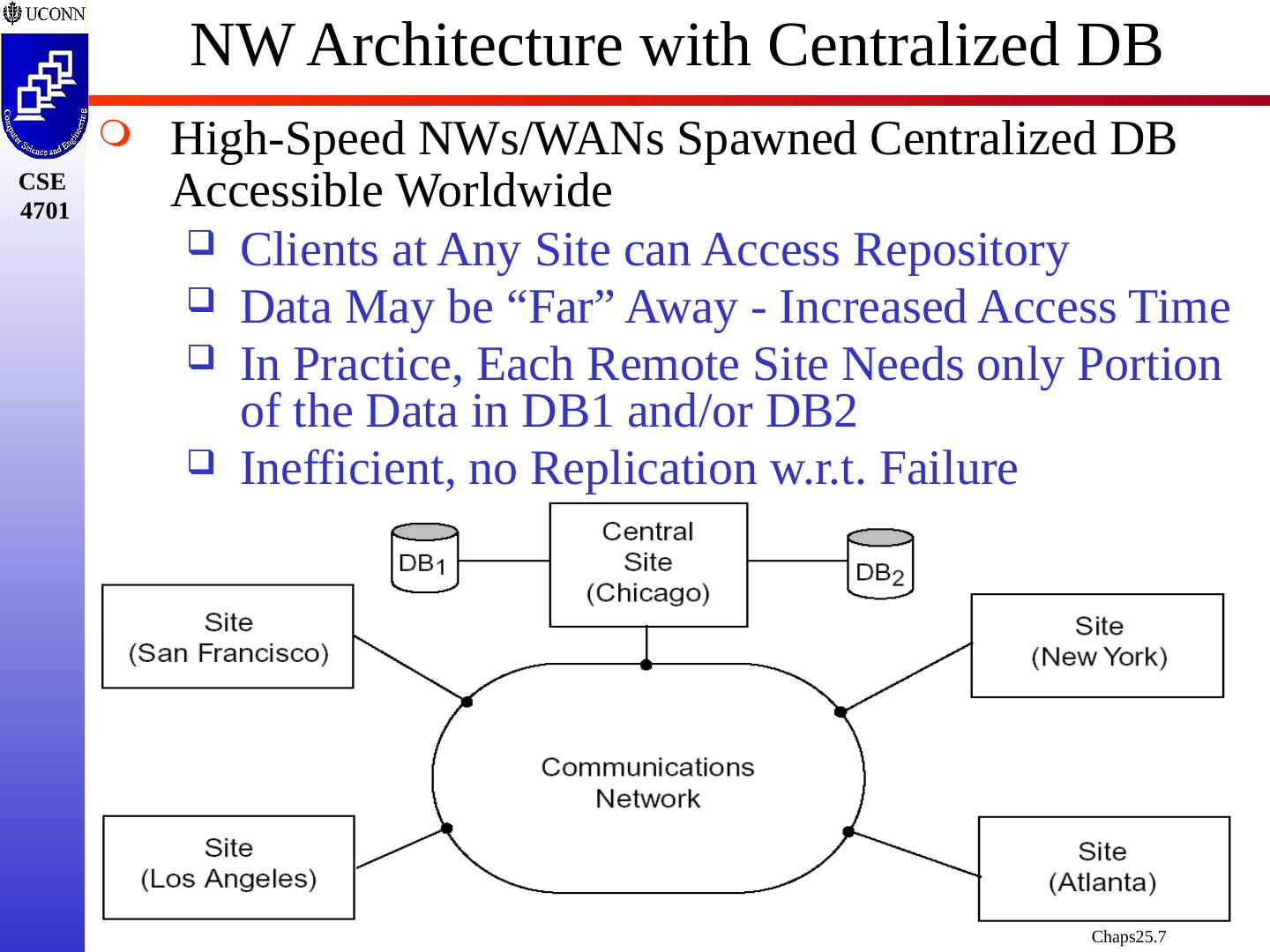 7 .NW Architecture with Centralized DB High-Speed NWs/WANs Spawned Centralized DB Accessible Worldwide Clients at Any Site can Access Repository Data May be “Far” Away - Increased Access Time In Practice, Each Remote Site Needs only Portion of the Data in DB1 and/or DB2 Inefficient, no Replication w.r.t. Failure