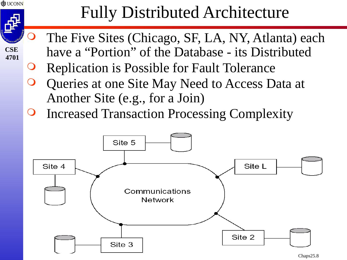 8 .Fully Distributed Architecture The Five Sites (Chicago, SF, LA, NY, Atlanta) each have a “Portion” of the Database - its Distributed Replication is Possible for Fault Tolerance Queries at one Site May Need to Access Data at Another Site (e.g., for a Join) Increased Transaction Processing Complexity