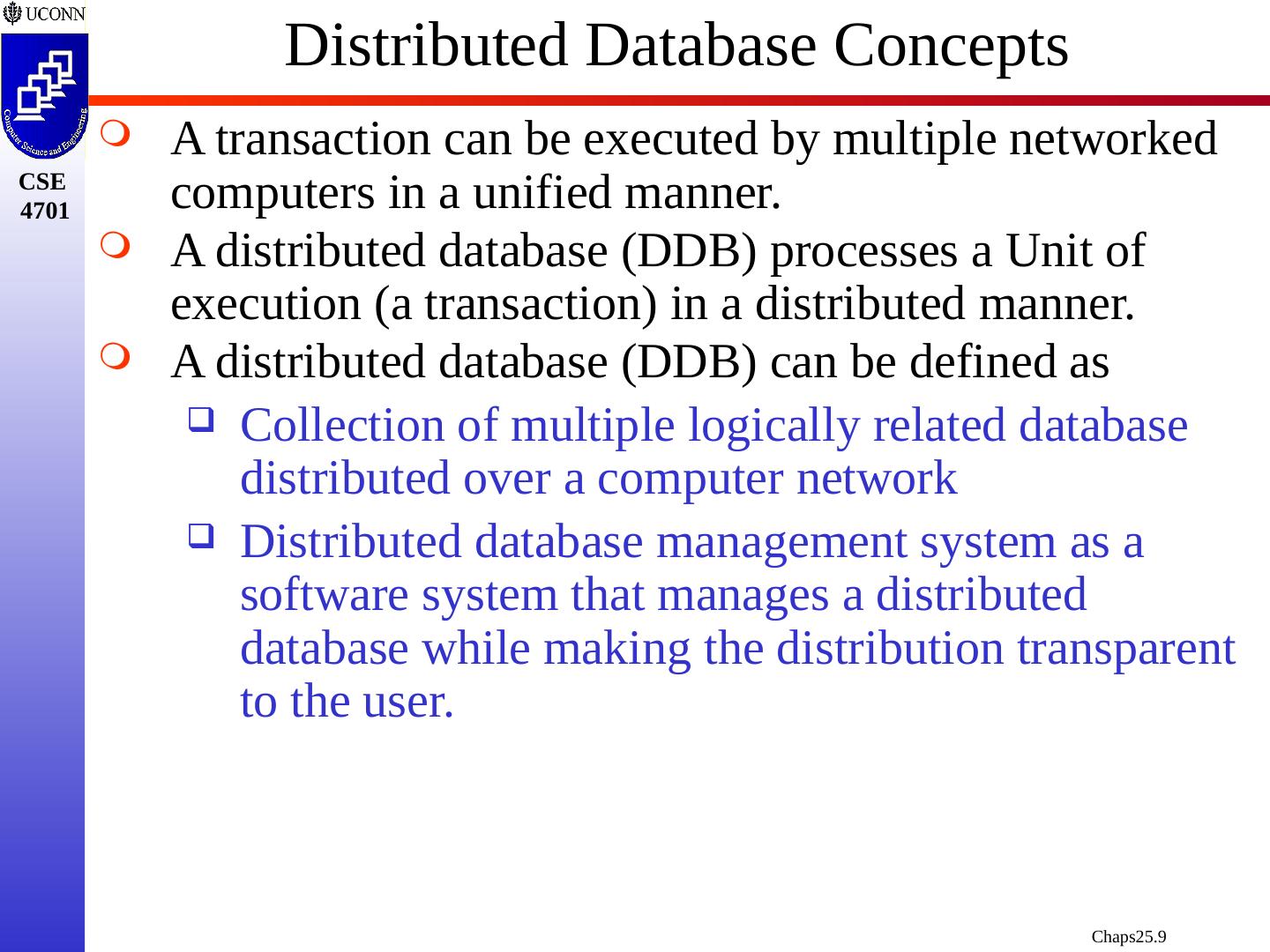 9 .Distributed Database Concepts A transaction can be executed by multiple networked computers in a unified manner. A distributed database (DDB) processes a Unit of execution (a transaction) in a distributed manner. A distributed database (DDB) can be defined as Collection of multiple logically related database distributed over a computer network Distributed database management system as a software system that manages a distributed database while making the distribution transparent to the user.