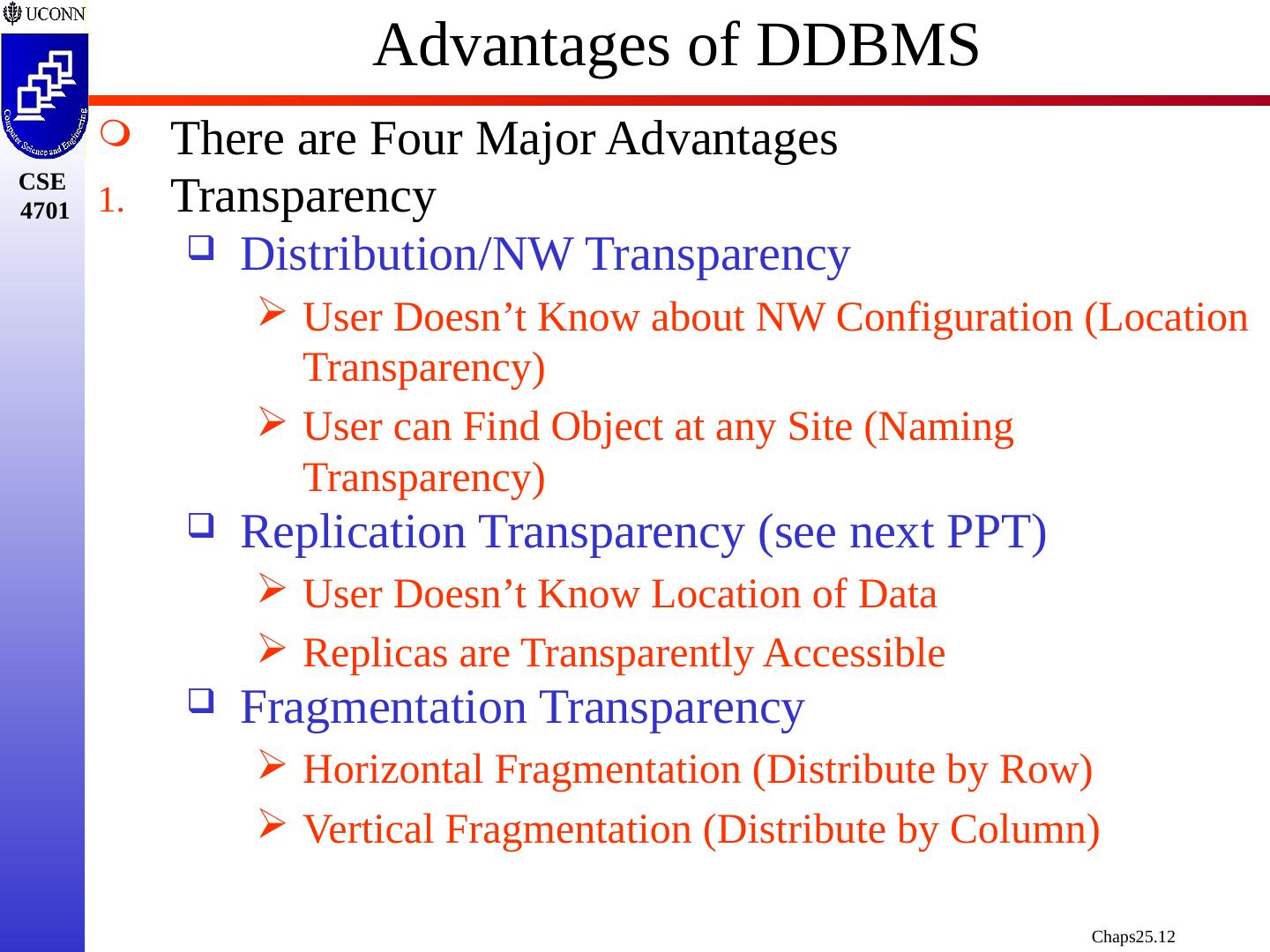 12 .Advantages of DDBMS There are Four Major Advantages Transparency Distribution/NW Transparency User Doesn’t Know about NW Configuration (Location Transparency) User can Find Object at any Site (Naming Transparency) Replication Transparency (see next PPT) User Doesn’t Know Location of Data Replicas are Transparently Accessible Fragmentation Transparency Horizontal Fragmentation (Distribute by Row) Vertical Fragmentation (Distribute by Column)