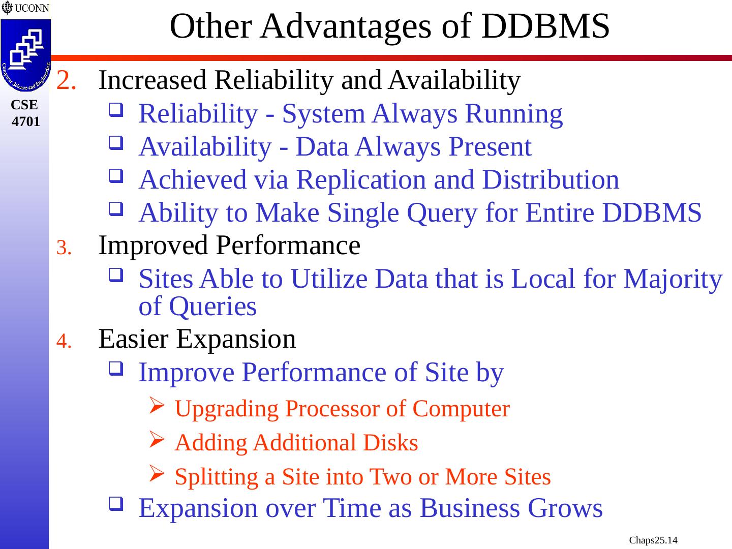 14 .Other Advantages of DDBMS Increased Reliability and Availability Reliability - System Always Running Availability - Data Always Present Achieved via Replication and Distribution Ability to Make Single Query for Entire DDBMS Improved Performance Sites Able to Utilize Data that is Local for Majority of Queries Easier Expansion Improve Performance of Site by Upgrading Processor of Computer Adding Additional Disks Splitting a Site into Two or More Sites Expansion over Time as Business Grows