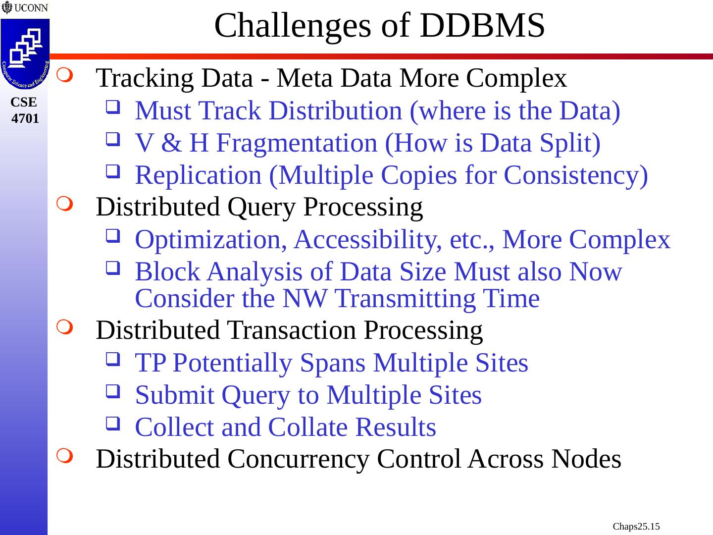 15 .Challenges of DDBMS Tracking Data - Meta Data More Complex Must Track Distribution (where is the Data) V & H Fragmentation (How is Data Split) Replication (Multiple Copies for Consistency) Distributed Query Processing Optimization, Accessibility, etc., More Complex Block Analysis of Data Size Must also Now Consider the NW Transmitting Time Distributed Transaction Processing TP Potentially Spans Multiple Sites Submit Query to Multiple Sites Collect and Collate Results Distributed Concurrency Control Across Nodes
