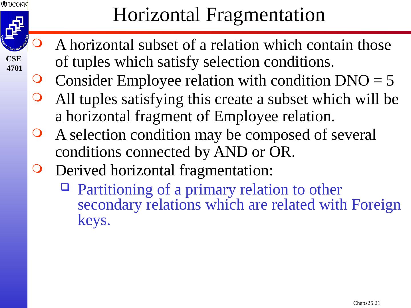 21 .Horizontal Fragmentation A horizontal subset of a relation which contain those of tuples which satisfy selection conditions. Consider Employee relation with condition DNO = 5 All tuples satisfying this create a subset which will be a horizontal fragment of Employee relation. A selection condition may be composed of several conditions connected by AND or OR . Derived horizontal fragmentation: Partitioning of a primary relation to other secondary relations which are related with Foreign keys.