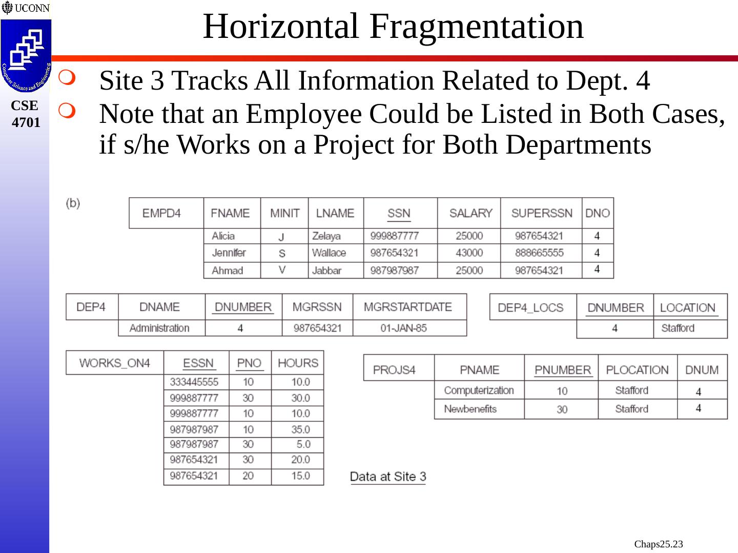 23 .Horizontal Fragmentation Site 3 Tracks All Information Related to Dept. 4 Note that an Employee Could be Listed in Both Cases, if s/he Works on a Project for Both Departments