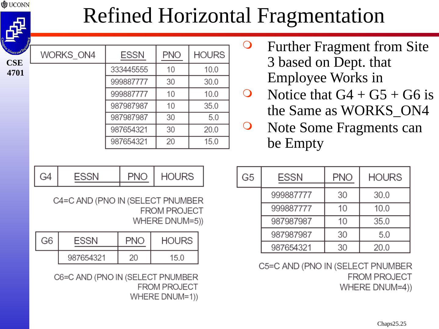 25 .Refined Horizontal Fragmentation Further Fragment from Site 3 based on Dept. that Employee Works in Notice that G4 + G5 + G6 is the Same as WORKS_ON4 Note Some Fragments can be Empty