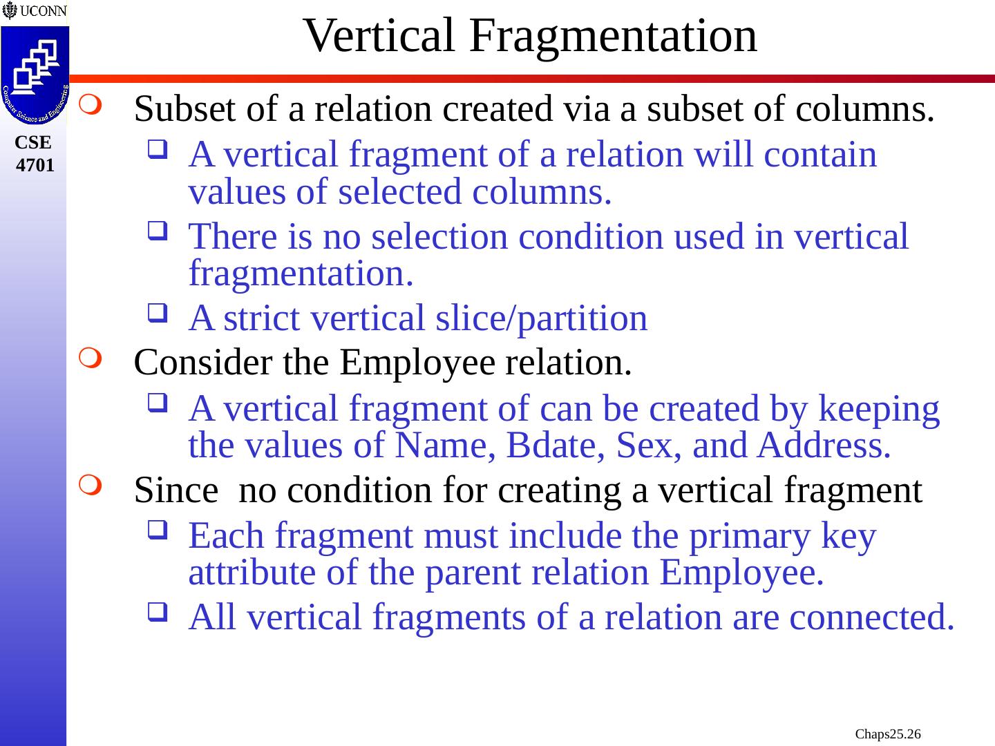 26 .Vertical Fragmentation Subset of a relation created via a subset of columns. A vertical fragment of a relation will contain values of selected columns. There is no selection condition used in vertical fragmentation. A strict vertical slice/partition Consider the Employee relation. A vertical fragment of can be created by keeping the values of Name, Bdate , Sex, and Address. Since no condition for creating a vertical fragment Each fragment must include the primary key attribute of the parent relation Employee. All vertical fragments of a relation are connected.