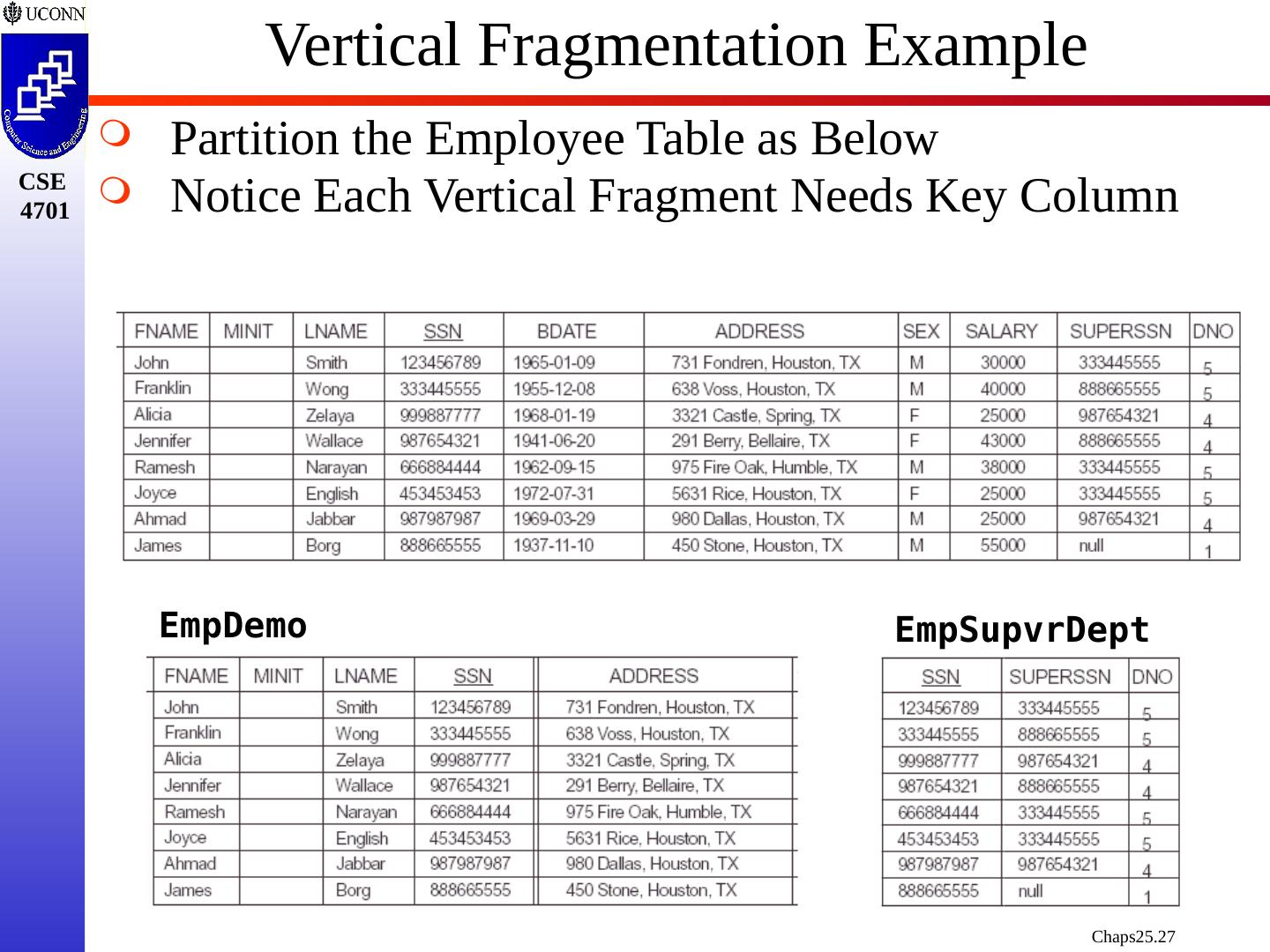 27 .Vertical Fragmentation Example Partition the Employee Table as Below Notice Each Vertical Fragment Needs Key Column EmpDemo EmpSupvrDept