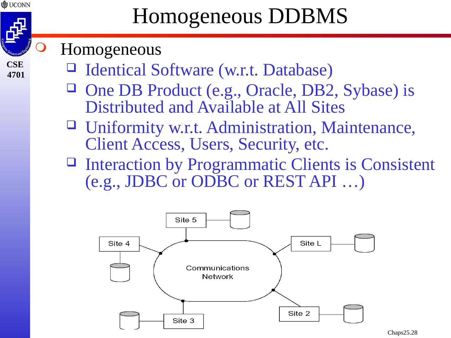 28 .Homogeneous DDBMS Homogeneous Identical Software (w.r.t. Database) One DB Product (e.g., Oracle, DB2, Sybase) is Distributed and Available at All Sites Uniformity w.r.t. Administration, Maintenance, Client Access, Users, Security, etc. Interaction by Programmatic Clients is Consistent (e.g., JDBC or ODBC or REST API …)