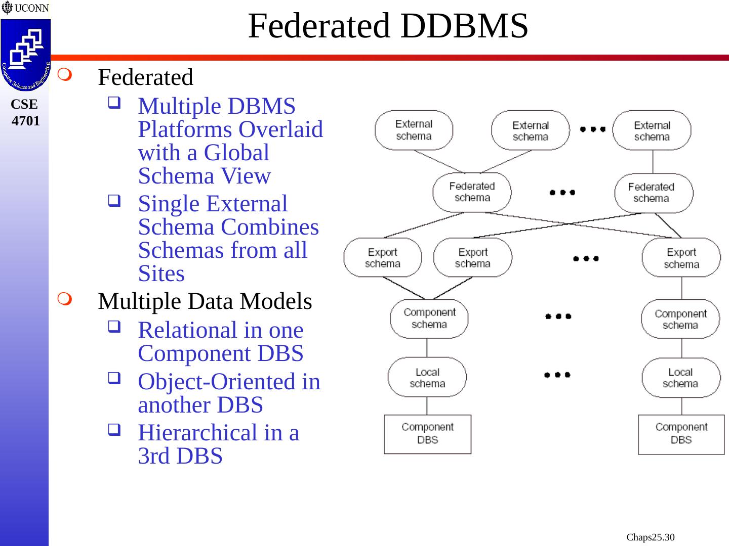 29 .Non-Federated Heterogeneous DDBMS Non-Federated Heterogeneous Different Software (w.r.t. Database) Multiple DB Products (e.g., Oracle at One Site, MySQL at another, Sybase, Informix, etc.) Replicated Administration (e.g., Users Needs Accounts on Multiple Systems) Varied Programmatic Access - SWEs Must Know All Platforms/Client Software Complicated Very Close to Shared Nothing Architecture